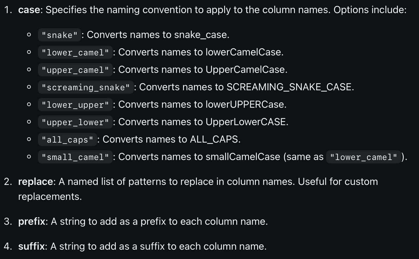 The clean_names function is used to clean column (variable) names. Sometimes the names of the columns are not in the format that we would like. Maybe we want them to be in all lower case, or maybe we want to replace spaces with underscores. The clean_names function can be used to clean the column names. Here are the different options you can use with the clean_names function: