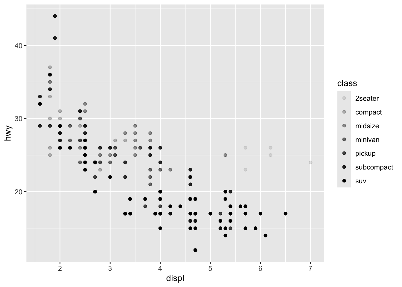 geom_point(mapping = aes(x = displ, y = hwy, alpha = class))Warning: Using alpha for a discrete variable is not advised.