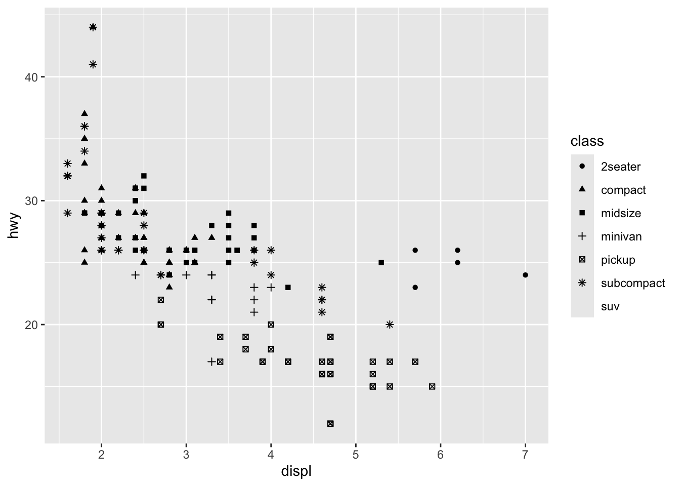 geom_point(mapping = aes(x = displ, y = hwy, shape = class))Warning: The shape palette can deal with a maximum of 6 discrete values because more