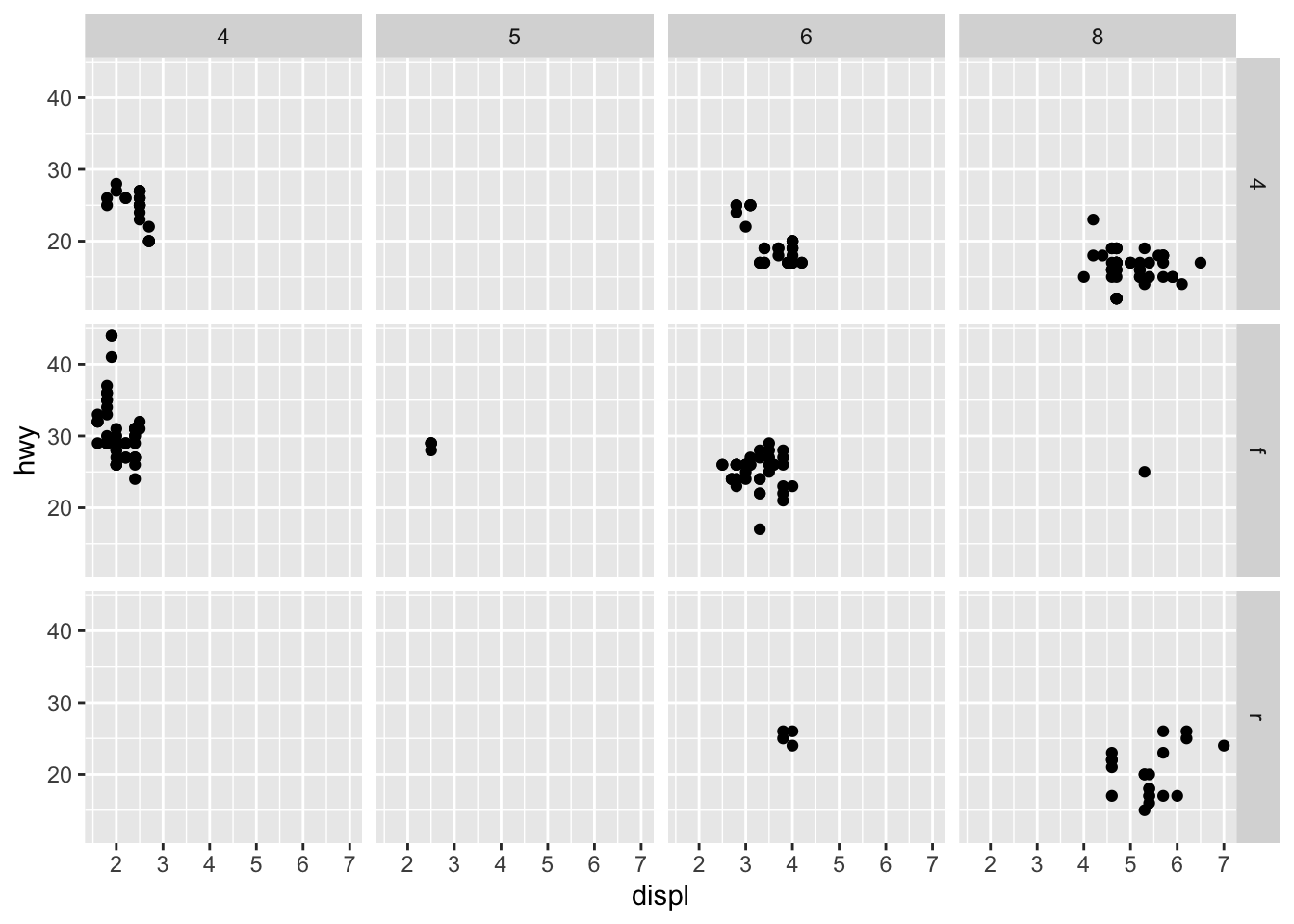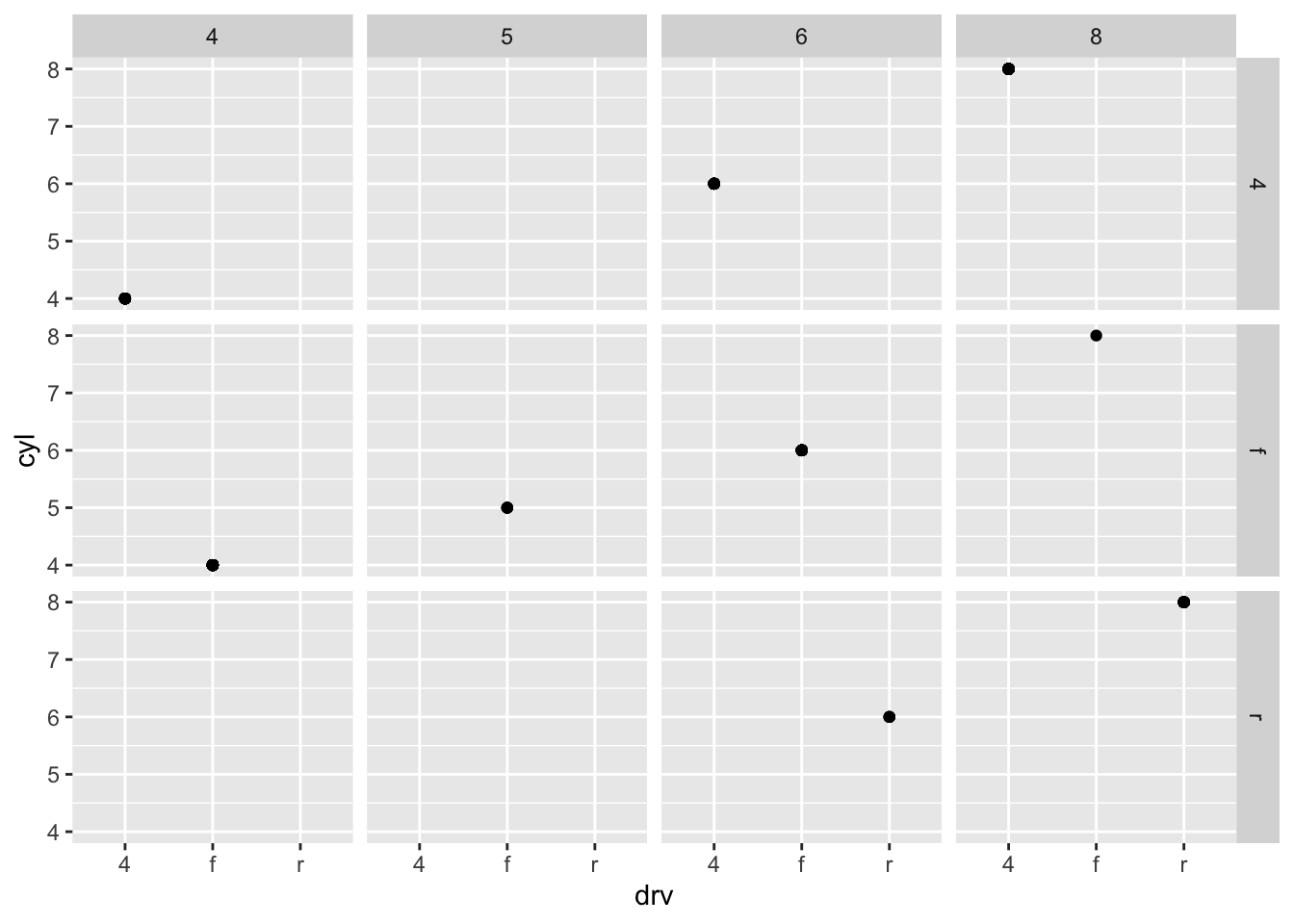 What do the empty cells in plot with facet_grid(drv ~ cyl) mean? How do they relate to this plot?