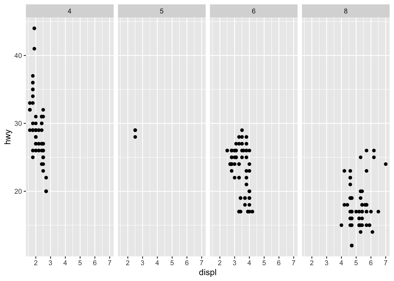 Let’s look at an example. Create a graph comparing displ (engine displacement, in litres) to hwy (highway miles per gallon), but faceted with cty (city miles per gallon) :