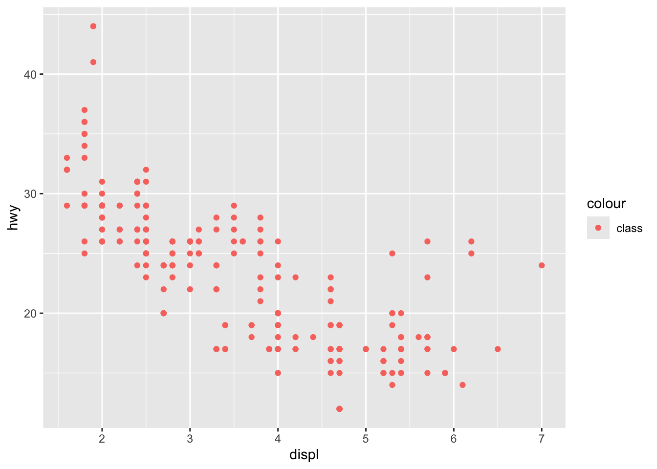 You can convey information about your data by mapping the aesthetics in your plot to the variables in your dataset. For example, you can map the colors of your points to the class variable to reveal the class of each car.