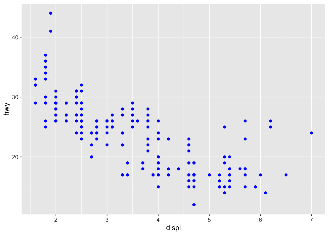 geom_point(mapping = aes(x = displ, y = hwy), color = "blue")
