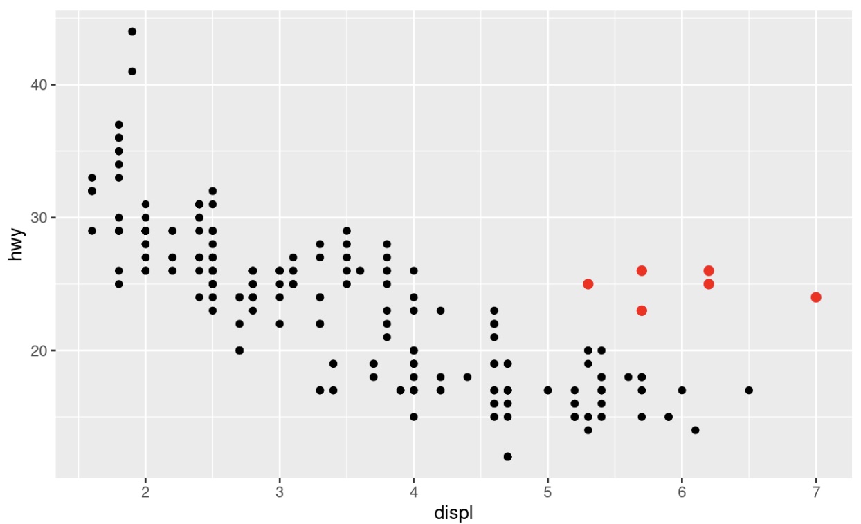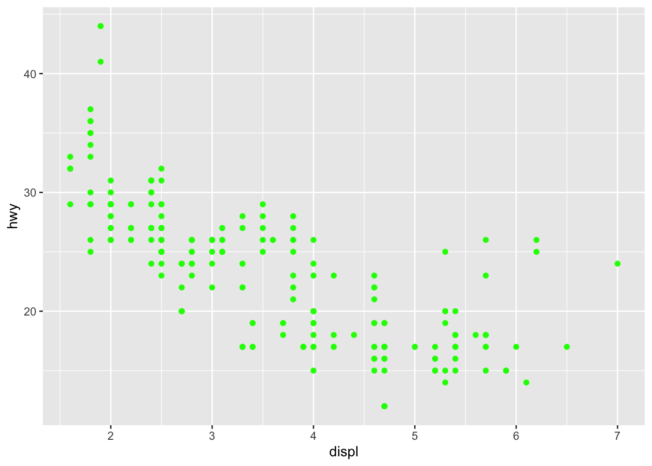 Here, the color doesn’t convey information about a variable, but only changes the appearance of the plot. To set an aesthetic manually, set the aesthetic by name as an argument of your geom function; i.e. it goes outside of aes(). You’ll need to pick a level that makes sense for that aesthetic: