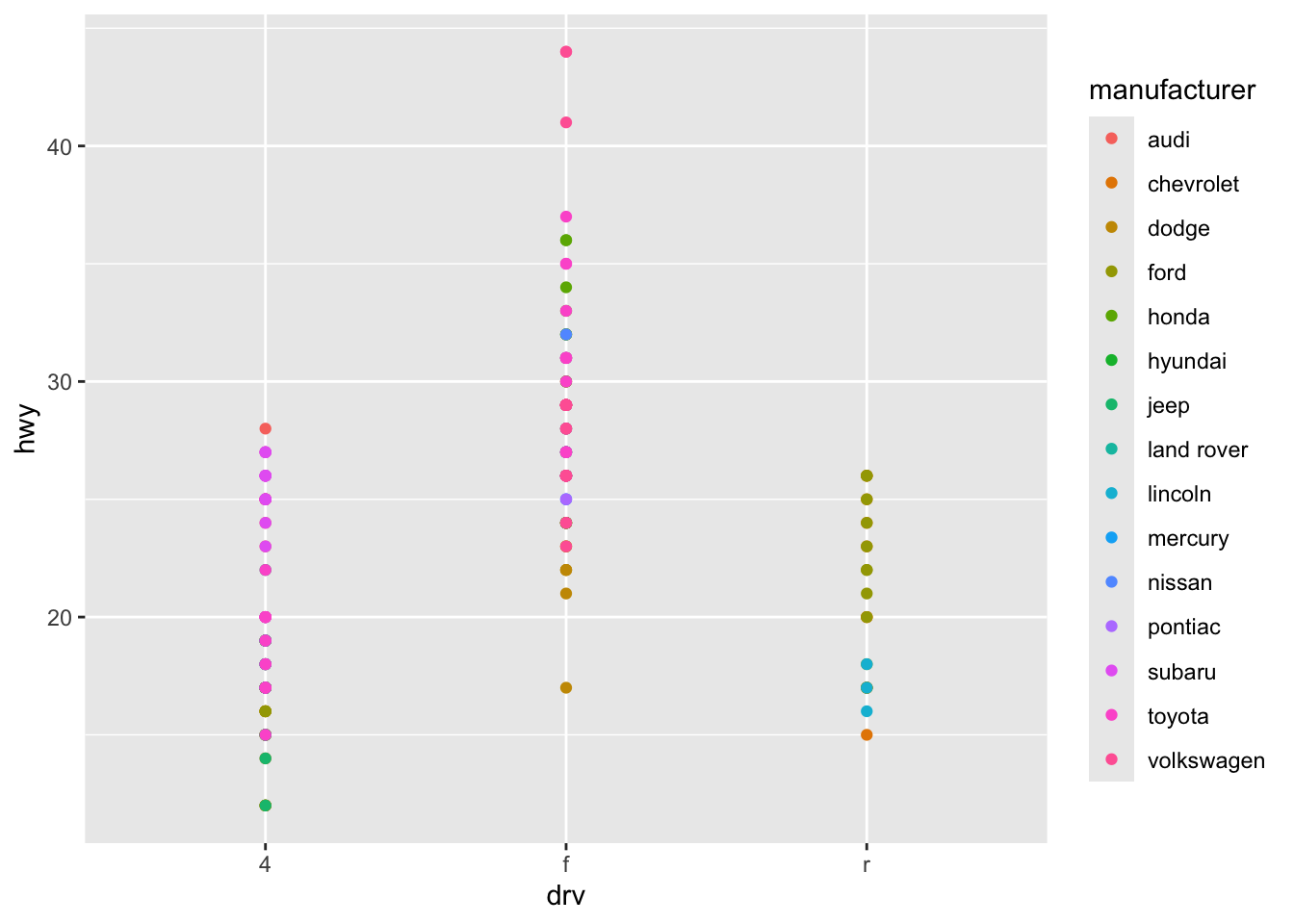 ggplot(data=mpg, aes(x=drv, y=hwy, color = manufacturer)) +