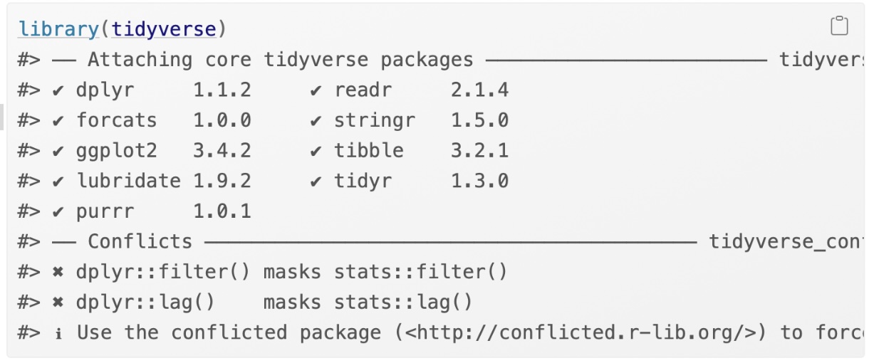 That one line of code loads the core tidyverse; packages which you will use in almost every data analysis. It also tells you which functions from the tidyverse conflict with functions in base R (or from other packages you might have loaded).