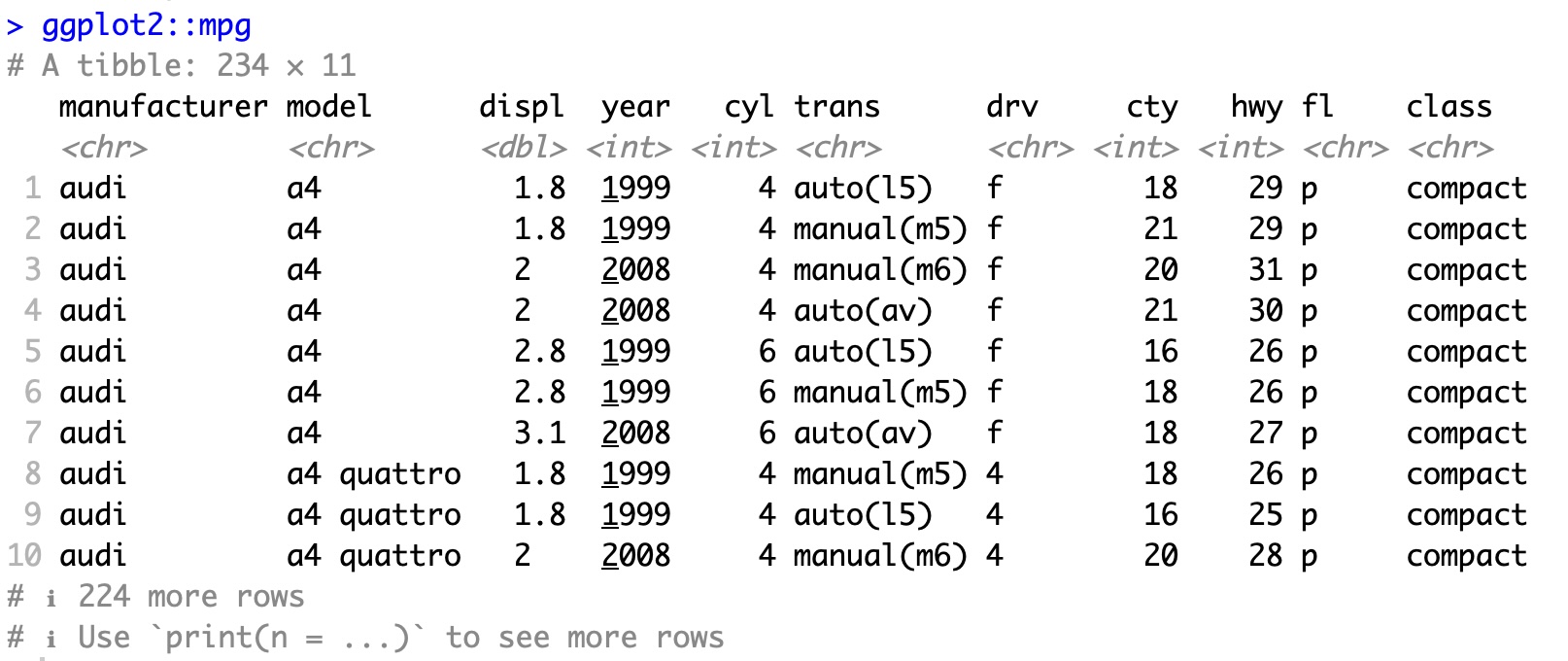 You can test your answer with the mpg data frame found in ggplot2 (aka ggplot2::mpg). A data frame is a rectangular collection of variables (in the columns) and observations (in the rows). mpg contains observations collected by the US Environmental Protection Agency on 38 models of car.