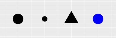 You can add a third variable, such as class, to a two dimensional scatterplot by mapping it to an aesthetic. An aesthetic is a visual property of the objects in your plot. Aesthetics include things like the size, the shape, or the color of your points. You can display a point (like the one below) in different ways by changing the values of its aesthetic properties. Since we already use the word “value” to describe data, let’s use the word “level” to describe aesthetic properties. Here we change the levels of a point’s size, shape, and color to make the point small, triangular, or blue: