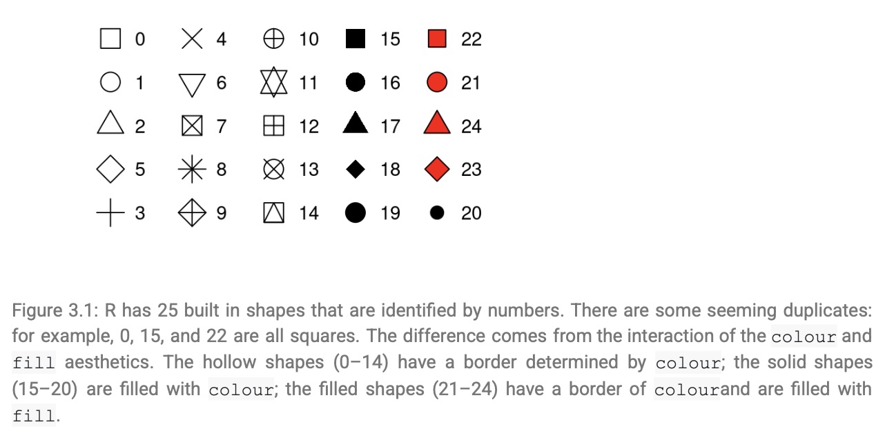 geom_point(shape = 21, colour = "black", fill = "white", size = 5)The “stroke” command perhaps refers to the size of the stroke of the pen being used? This means a bigger stroke has a bigger outline?