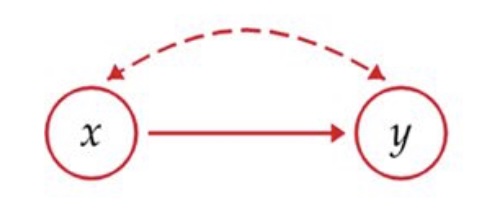 The way you can interpret this graphic is as follows. A researcher wonders if variable X causes a change in variable Y The researcher then takes in some data and from the data it looks like there is a relationship between the two variables. This is denoted by the dashed arrow. This dashed arrow is telling us that their appear to be some type of association between the variables. As it turns out, variable X is the only variable causing a change in variable Y This is represented by the solid arrow in the graph.