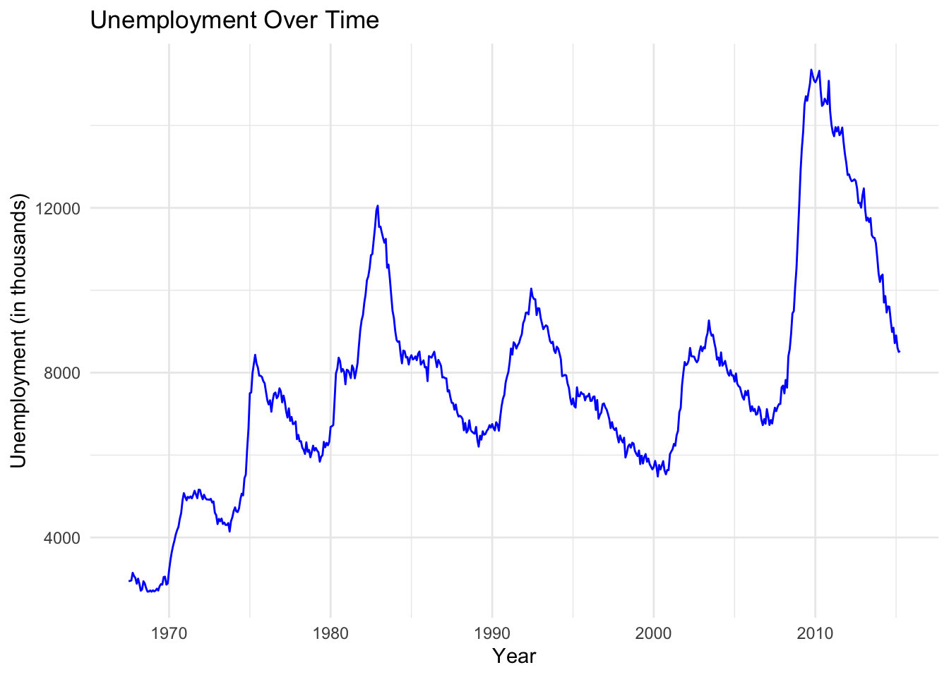 # Load necessary librarieslibrary(ggplot2)library(dplyr)# Load built-in economics datasetdata("economics")# Create a time series line plot of unemployment rateeconomics %>%ggplot(aes(x = date, y = unemploy)) +geom_line(color ="blue") +labs(title ="Unemployment Over Time",x ="Year",y ="Unemployment (in thousands)") +theme_minimal()