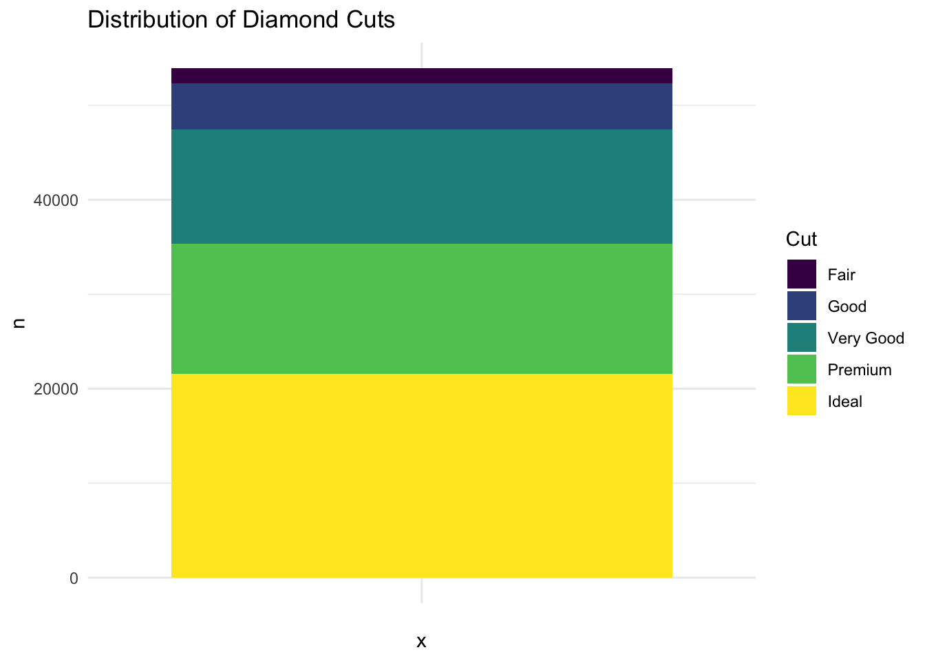 What we want is a stacked bar chart, so we don’t want the x-axis to be the cut of the diamond. Instead, we want the x-axis to be an empty string (x = ""). This will create a bar chart with only one bar. We will take this output and create a stacked barplot of the distribution of diamond cuts using another pipe and sending the output to ggplot and then to geom_bar. We finish off the bar chart by adding some labels, fills, and a theme.