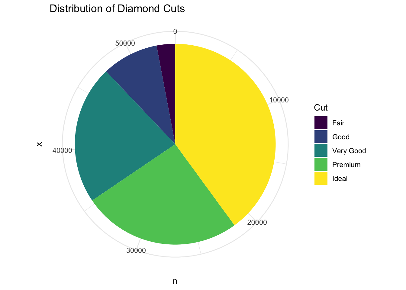 # Load necessary librarieslibrary(ggplot2)library(dplyr)# Create a pie chart of the distribution of diamond cuts# We will create the bar chart as we did above, but this time we will use# coord_polar to make it circular.# Lastly we will add some labels and some colors# The fill color is the cut of the diamond and the sizes of the pieces of the # pie are based on the number of diamondsdiamonds %>%count(cut) %>%ggplot(aes(x ="", y = n, fill = cut)) +geom_bar(stat ="identity", width =1) +coord_polar(theta ="y") +labs(title ="Distribution of Diamond Cuts",fill ="Cut") +theme_minimal() +theme(legend.position ="right")