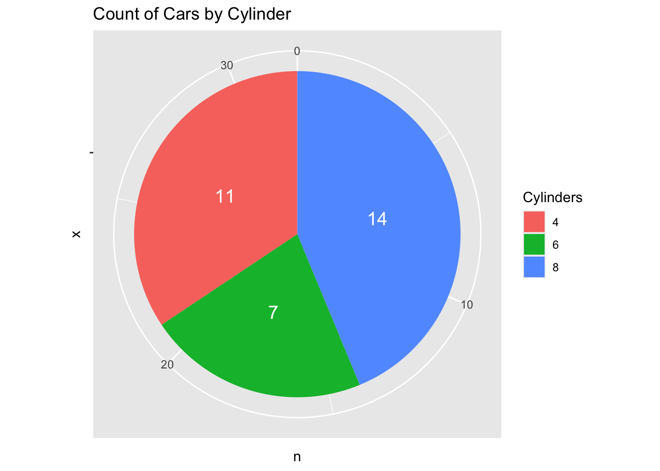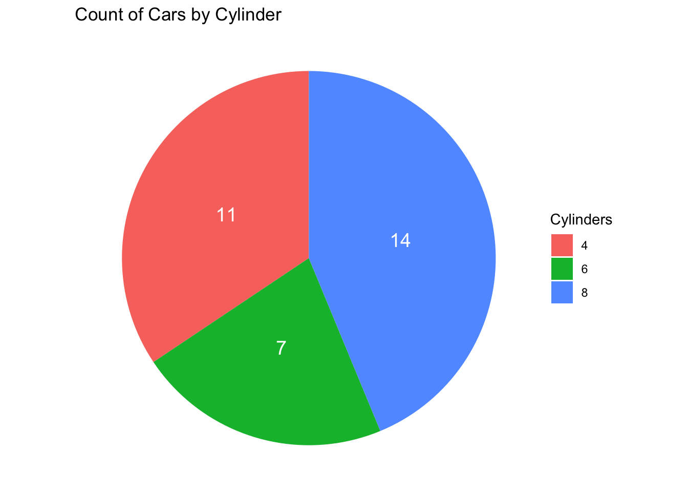 Let’s look at one more example by revisiting the mtcars dataset. We will create a pie chart that shows the distribution of car models by the number of cylinders.