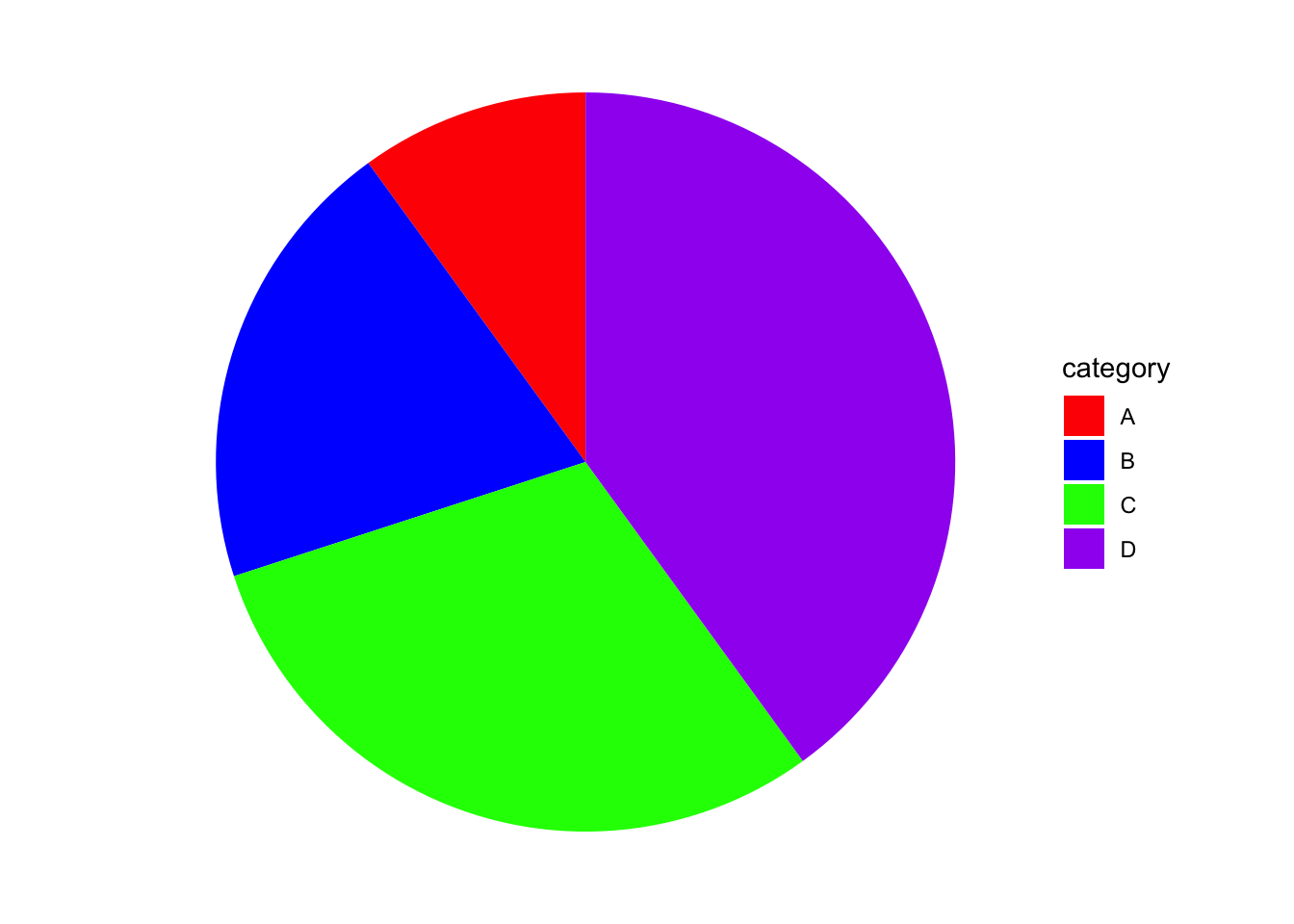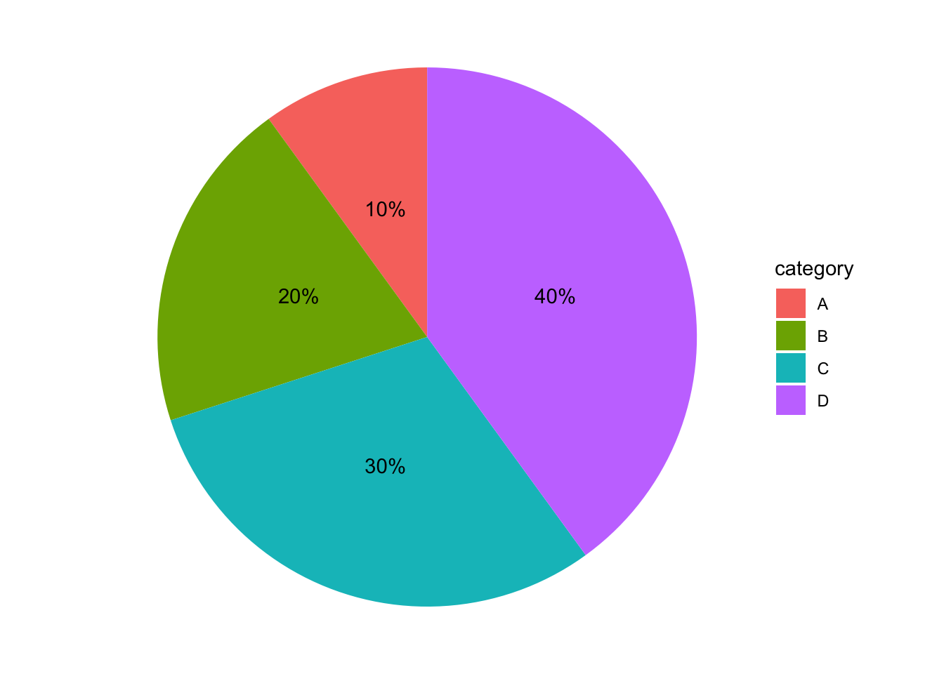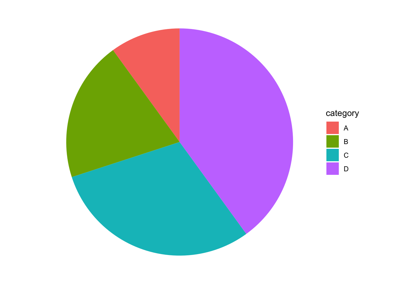 # Install and load ggplot2# install.packages("ggplot2")library(ggplot2)# Create data framedata <-data.frame(category =c("A", "B", "C", "D"),value =c(10, 20, 30, 40))# Create pie chartggplot(data, aes(x ="", y = value, fill = category)) +geom_bar(stat ="identity", width =1) +coord_polar(theta ="y") +theme_void()