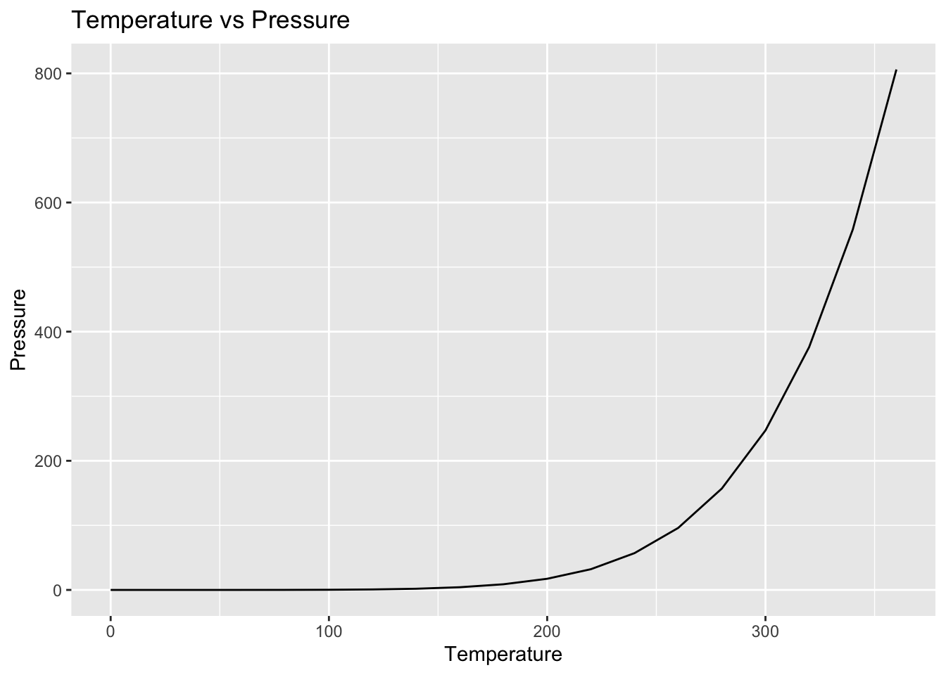 # Load ggplot2 librarylibrary(ggplot2)# Create line graphggplot(pressure, aes(x = temperature, y = pressure)) +geom_line() +labs(title ="Temperature vs Pressure",x ="Temperature",y ="Pressure")