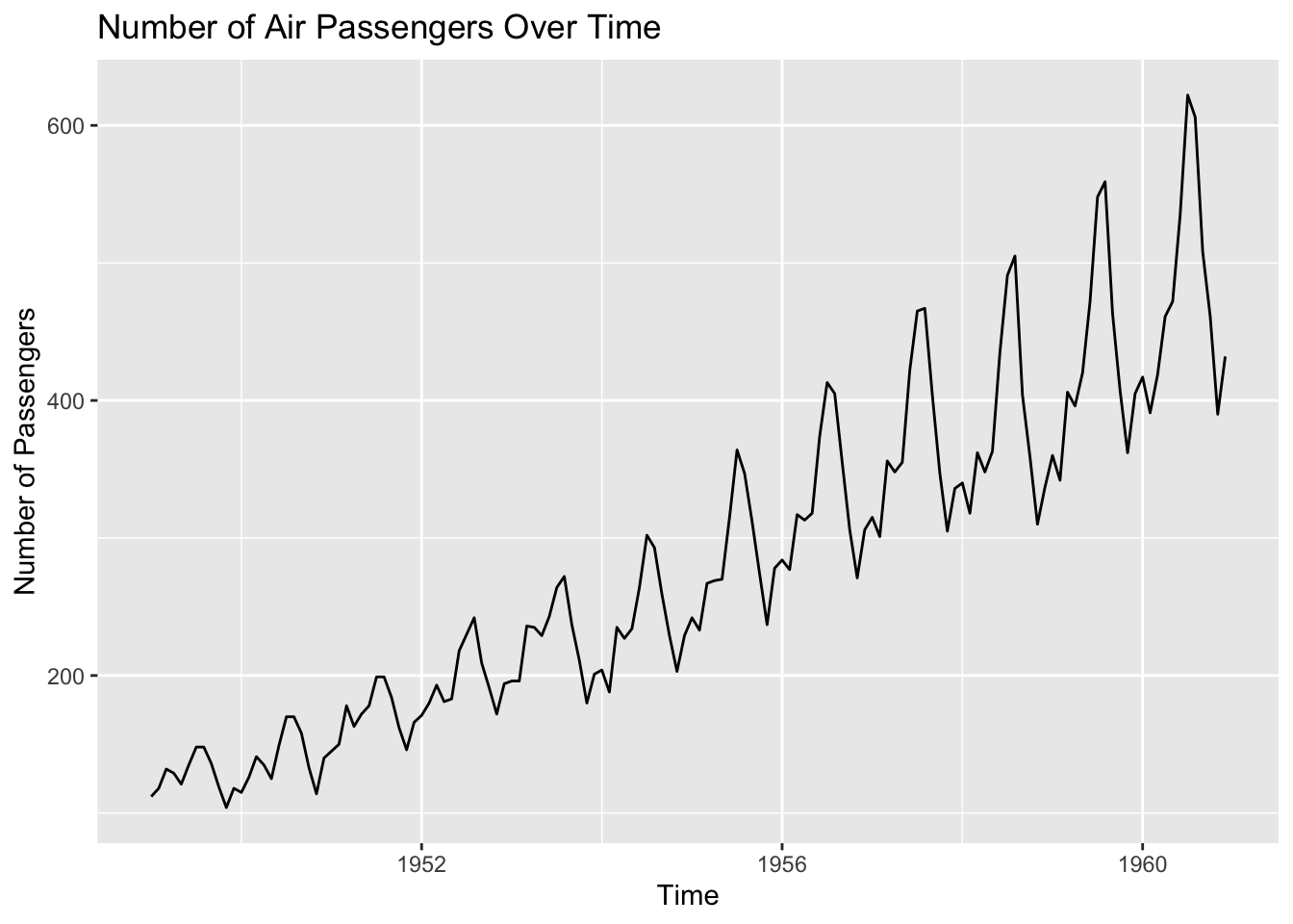 # Load ggplot2 librarylibrary(ggplot2)# Convert AirPassengers to data frameairpassengers_df <-data.frame(time =time(AirPassengers),passengers =as.numeric(AirPassengers))# Create line graphggplot(airpassengers_df, aes(x = time, y = passengers)) +geom_line() +labs(title ="Number of Air Passengers Over Time",x ="Time",y ="Number of Passengers")