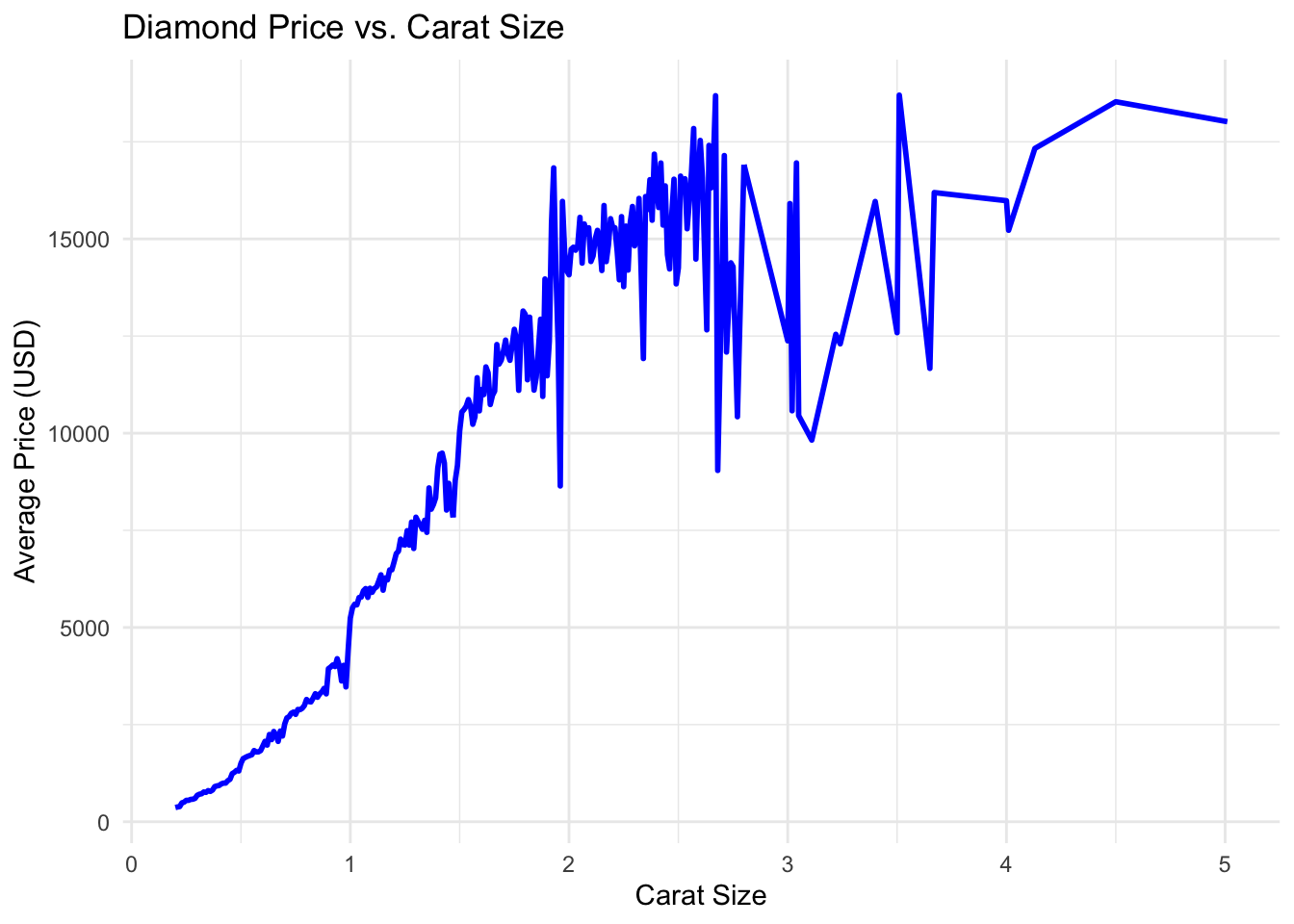 # Load the librarieslibrary(dplyr)library(ggplot2)# Create a line graph of the average price of diamonds over time# Aggregate data: Get the average price for each carat sizeavg_price_per_carat <-aggregate(price ~ carat, data = diamonds, FUN = mean)# Create the line graphggplot(avg_price_per_carat, aes(x = carat, y = price)) +geom_line(color ="blue", linewidth =1) +labs(title ="Diamond Price vs. Carat Size",x ="Carat Size",y ="Average Price (USD)") +theme_minimal()
