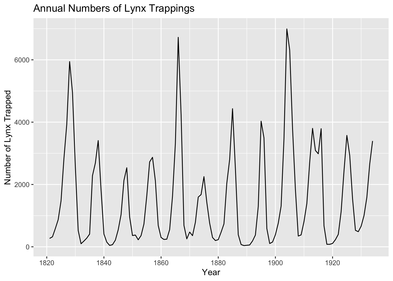 # Load ggplot2 librarylibrary(ggplot2)# Convert lynx to data framelynx_df <-data.frame(year =time(lynx),trappings =as.numeric(lynx))# Create line graphggplot(lynx_df, aes(x = year, y = trappings)) +geom_line() +labs(title ="Annual Numbers of Lynx Trappings",x ="Year",y ="Number of Lynx Trapped")