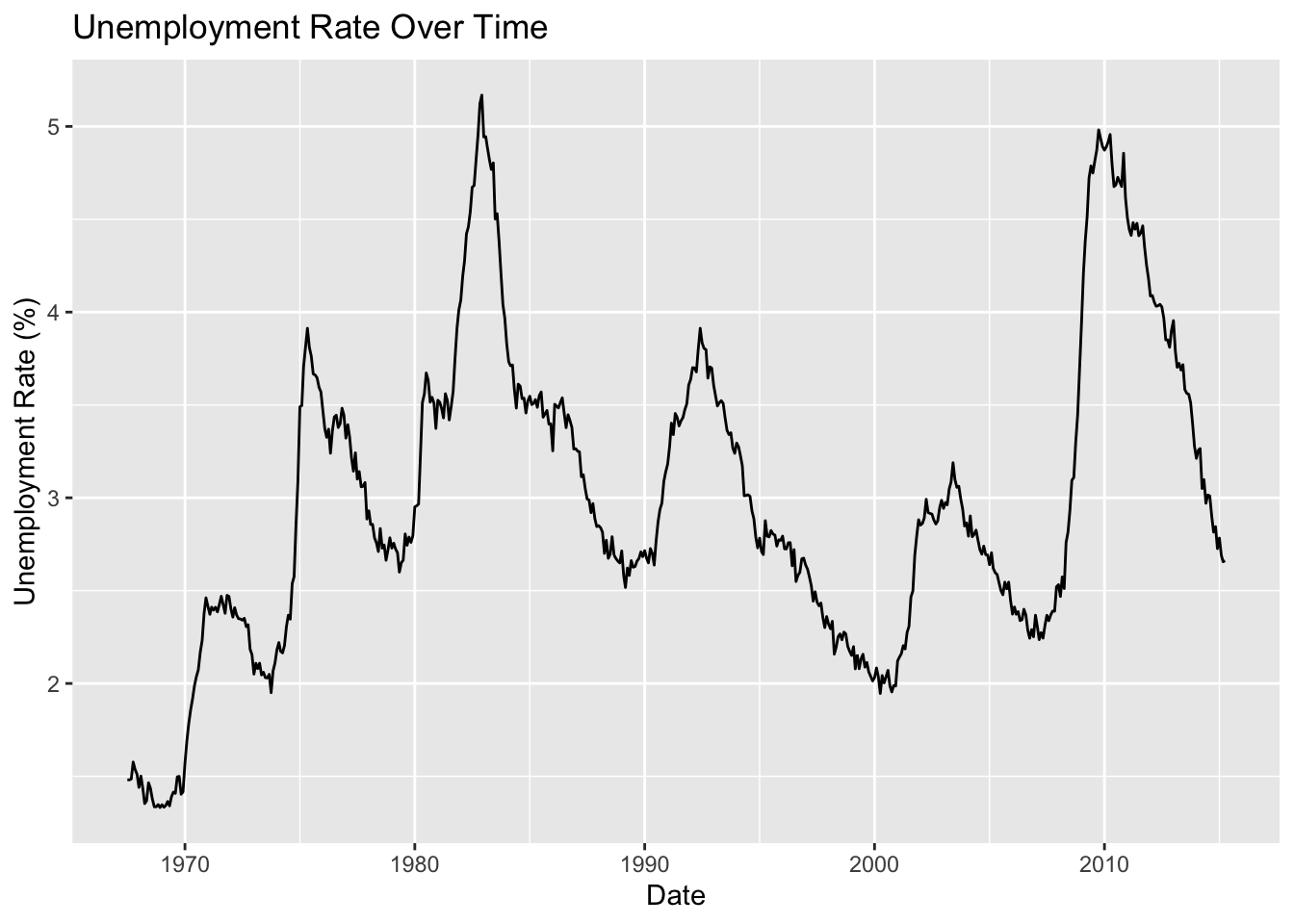 # Load ggplot2 librarylibrary(ggplot2)# Create line graphggplot(economics, aes(x = date, y = unemploy / pop *100)) +geom_line() +labs(title ="Unemployment Rate Over Time",x ="Date",y ="Unemployment Rate (%)")