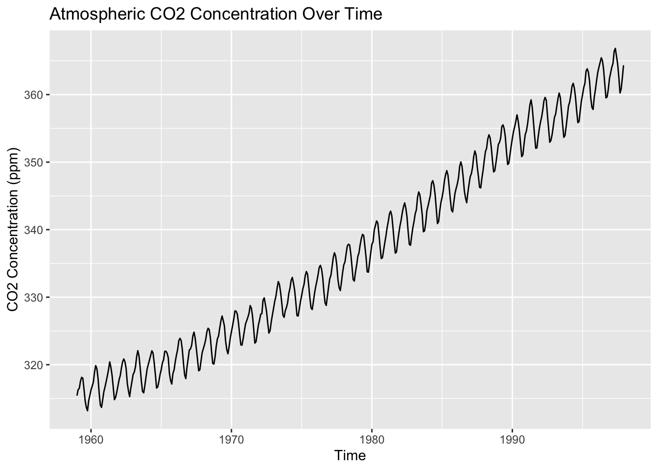 # Load ggplot2 librarylibrary(ggplot2)# Convert co2 to data frameco2_df <-data.frame(time =time(co2),concentration =as.numeric(co2))# Create line graphggplot(co2_df, aes(x = time, y = concentration)) +geom_line() +labs(title ="Atmospheric CO2 Concentration Over Time",x ="Time",y ="CO2 Concentration (ppm)")