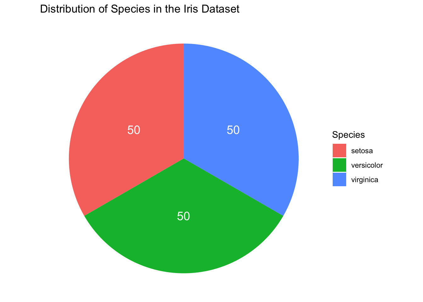 # Load ggplot2library(ggplot2)# Load iris datasetdata(iris)# Count species occurrencesspecies_count <-as.data.frame(table(iris$Species))# Create pie chartggplot(species_count, aes(x ="", y = Freq, fill = Var1)) +geom_bar(stat ="identity", width =1) +coord_polar(theta ="y") +geom_text(aes(label = Freq),position =position_stack(vjust =0.5),color ="white", size =5) +theme_void() +ggtitle("Distribution of Species in the Iris Dataset") +labs(fill ="Species")