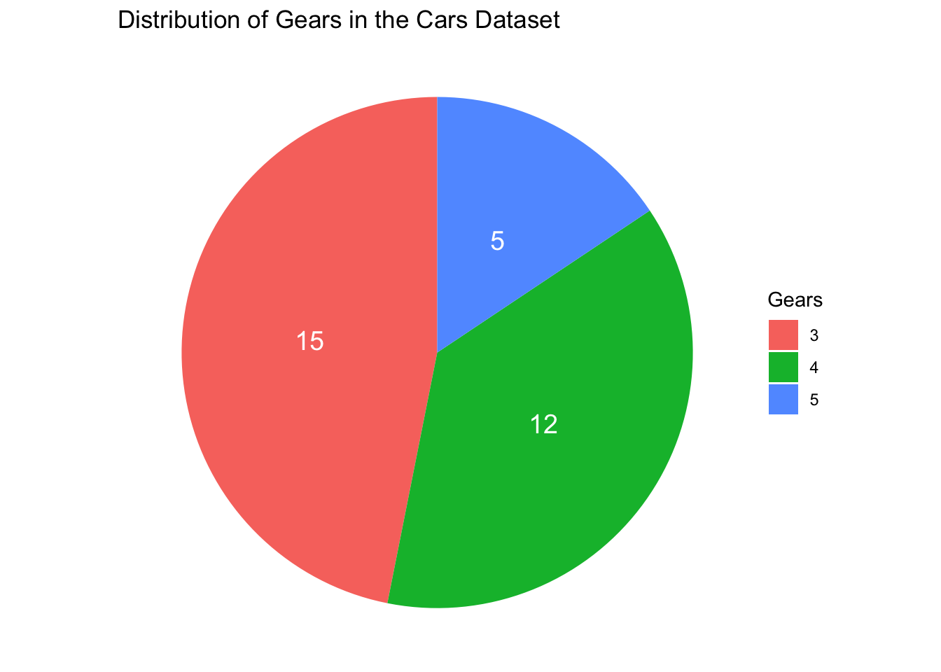 # Load ggplot2library(ggplot2)# Load cars datasetdata(mtcars)# Count gear occurrencesgear_count <-as.data.frame(table(mtcars$gear))# Create pie chartggplot(gear_count, aes(x ="", y = Freq, fill = Var1)) +geom_bar(stat ="identity", width =1) +coord_polar(theta ="y") +geom_text(aes(label = Freq),position =position_stack(vjust =0.5),color ="white", size =5) +theme_void() +ggtitle("Distribution of Gears in the Cars Dataset") +labs(fill ="Gears")