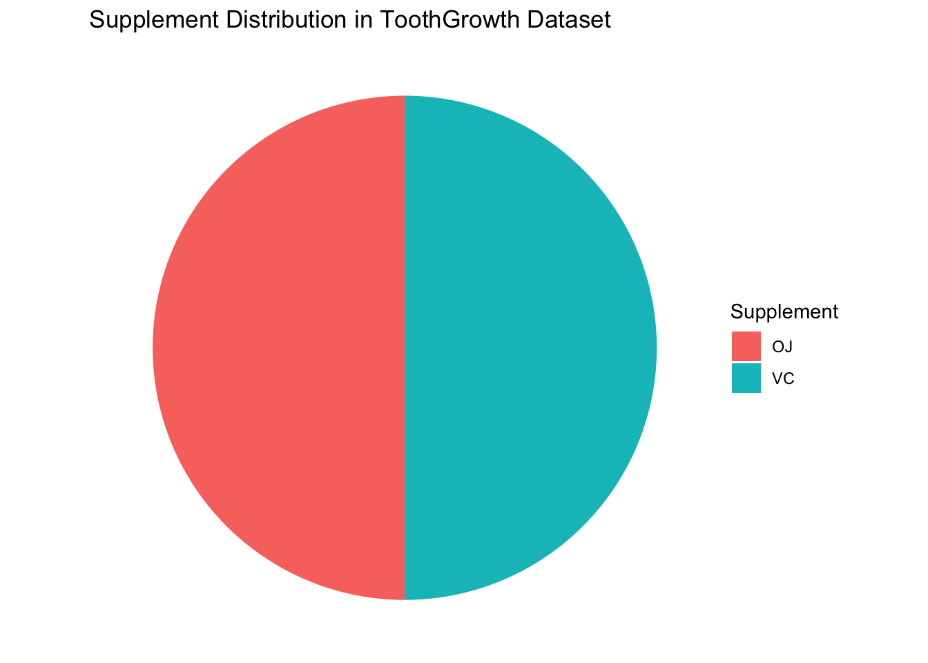 Task: Create a pie chart to show the distribution of the different supplements (VC and OJ) in the ToothGrowth dataset.