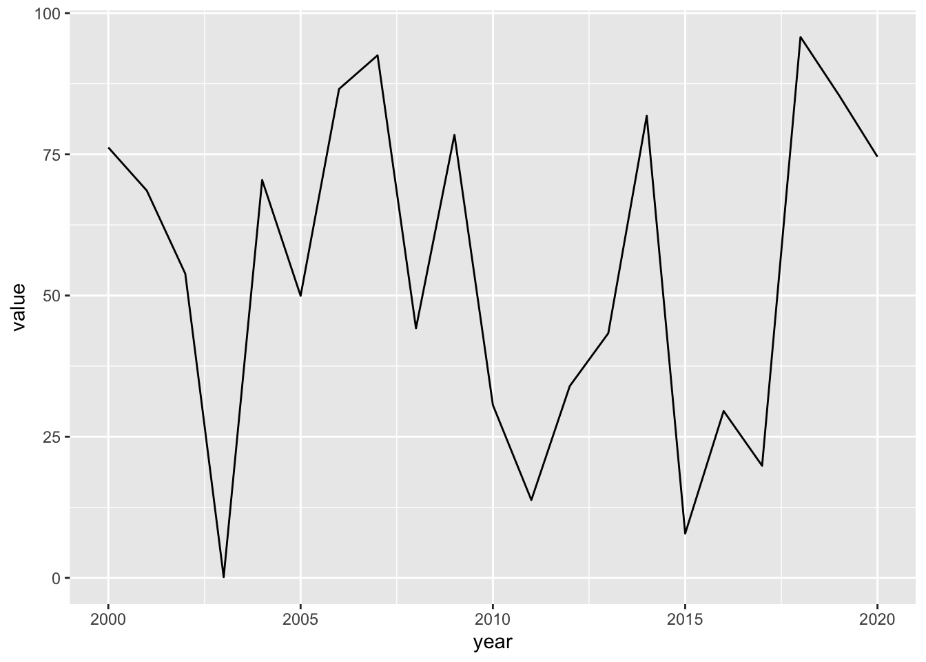 library(ggplot2)# Create data framedf <-data.frame(year =2000:2020,value =runif(21, min =0, max =100))# Create line graphggplot(df, aes(x = year, y = value)) +geom_line()