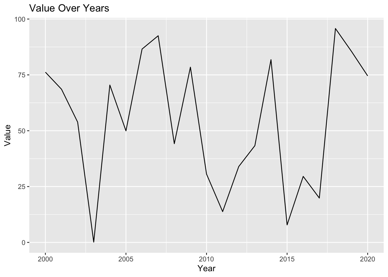 ggplot(df, aes(x = year, y = value)) +geom_line() +ggtitle("Value Over Years") +xlab("Year") +ylab("Value")