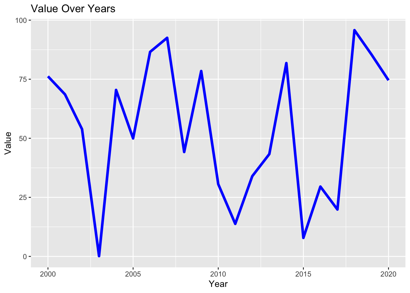 ggplot(df, aes(x = year, y = value)) +geom_line(color ="blue", size =1.5) +ggtitle("Value Over Years") +xlab("Year") +ylab("Value")