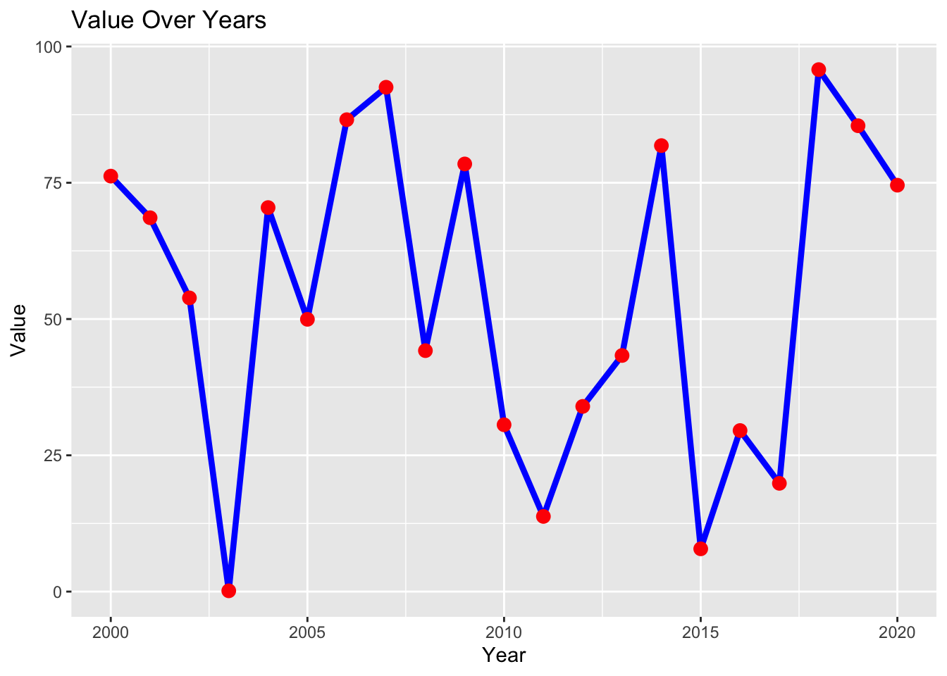 ggplot(df, aes(x = year, y = value)) +geom_line(color ="blue", size =1.5) +geom_point(color ="red", size =3) +ggtitle("Value Over Years") +xlab("Year") +ylab("Value")