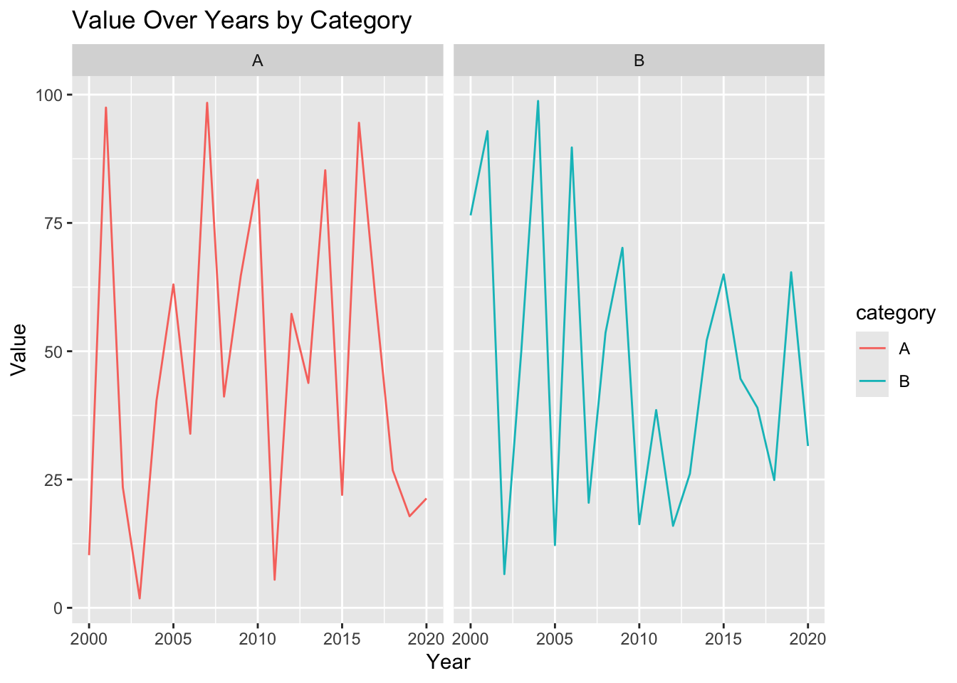 # Create data frame with categoriesdf <-data.frame(year =rep(2000:2020, 2),value =runif(42, min =0, max =100),category =rep(c("A", "B"), each =21))# Create faceted line graphggplot(df, aes(x = year, y = value, color = category)) +geom_line() +facet_wrap(~ category) +ggtitle("Value Over Years by Category") +xlab("Year") +ylab("Value")