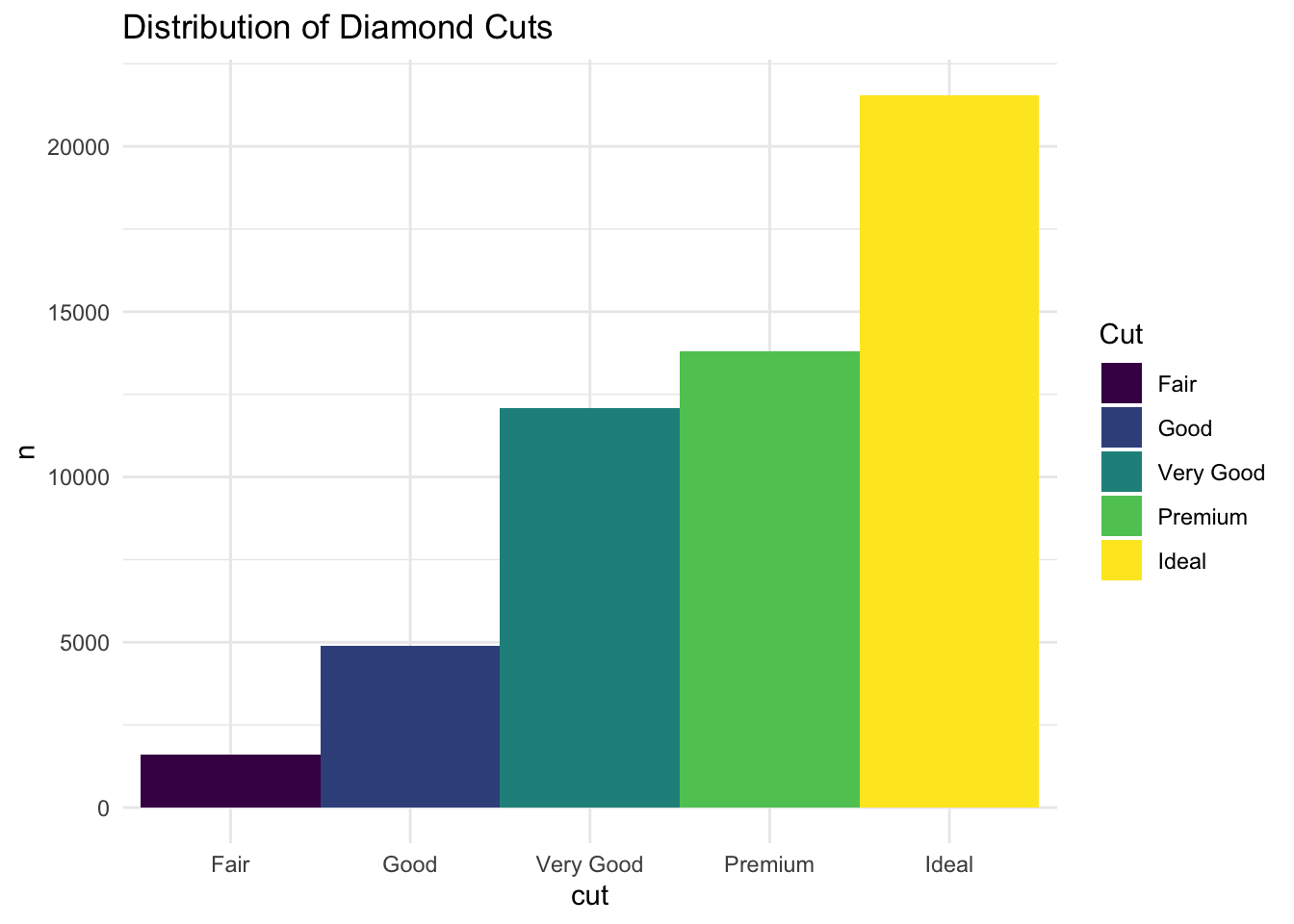 diamonds %>%count(cut) %>%ggplot(aes(x = cut, y = n, fill = cut)) +geom_bar(stat ="identity", width =1) +labs(title ="Distribution of Diamond Cuts",fill ="Cut") +theme_minimal() +theme(legend.position ="right")