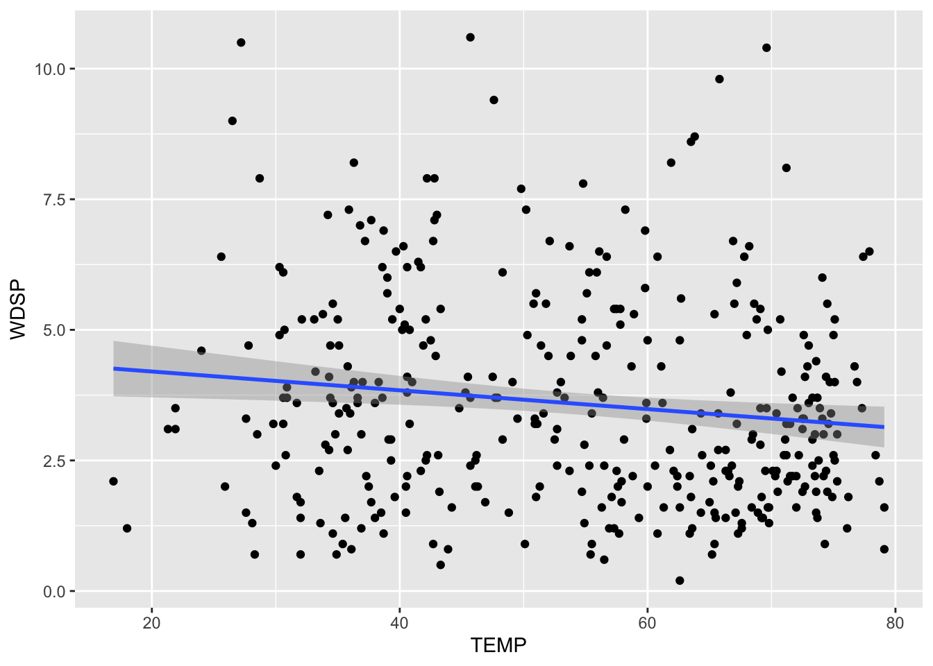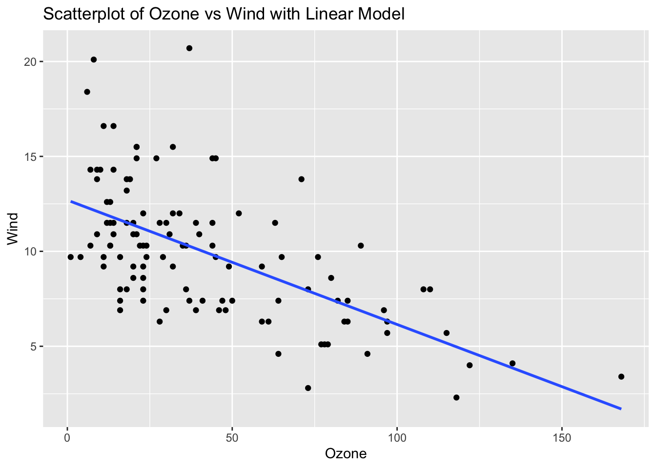 labs(title = "Scatterplot of Ozone vs Wind with Linear Model", x = "Ozone", y = "Wind")`geom_smooth()` using formula = 'y ~ x'