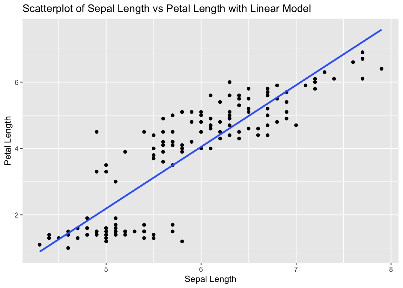 labs(title = "Scatterplot of Sepal Length vs Petal Length with Linear Model", x = "Sepal Length", y = "Petal Length")`geom_smooth()` using formula = 'y ~ x'