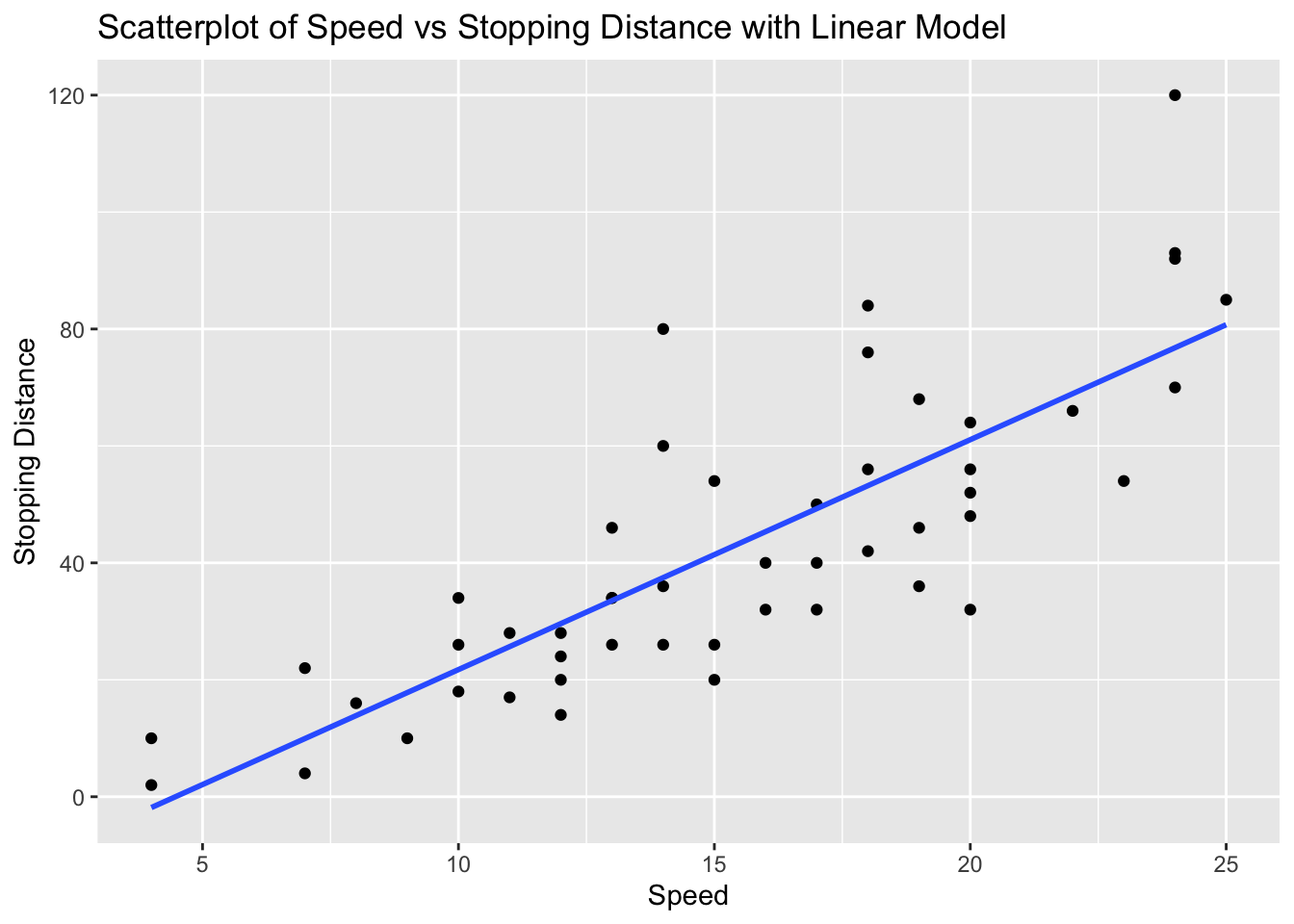 labs(title = "Scatterplot of Speed vs Stopping Distance with Linear Model", x = "Speed", y = "Stopping Distance")`geom_smooth()` using formula = 'y ~ x'