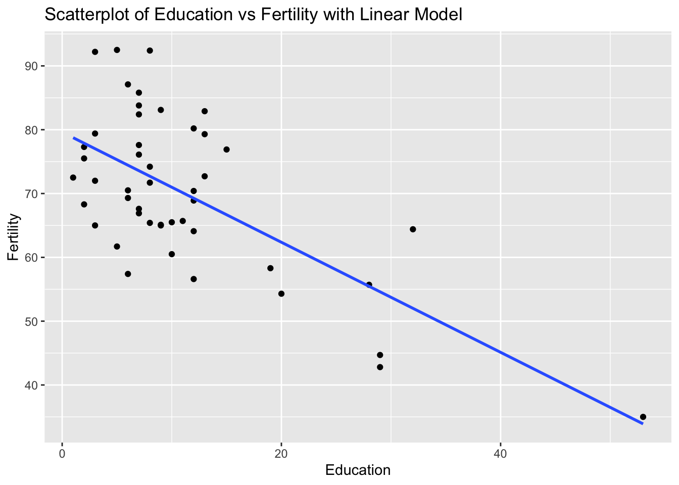 labs(title = "Scatterplot of Education vs Fertility with Linear Model", x = "Education", y = "Fertility")`geom_smooth()` using formula = 'y ~ x'
