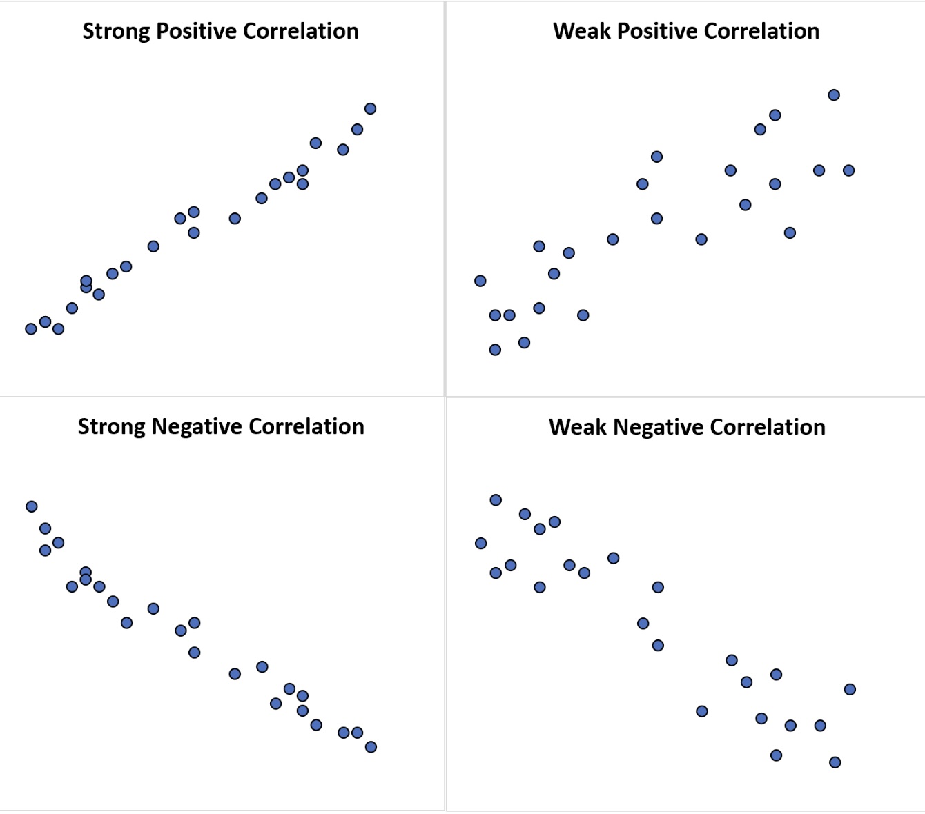 Once we had this picture of the data we were looking to see if there appeared to be any type of trend or pattern that emerged from the data. If there was, then this gave us enough evidence to move forward with the study. We talked about several different types of patterns that could appear in a scatterplot (linear, quadratic, exponential, logarightmic, etc.), but the type of pattern that we are going to focus on is a linear pattern. The pattern could follow a line very closely or perhaps have a somewhat positive or negative linear association. If the pattern closely follows a line then it will have a strong correlation close to 1 or -1 and as the pattern gets more loose, the correlation gets weaker and as it gets worse, the correlation gets closer to 0.
