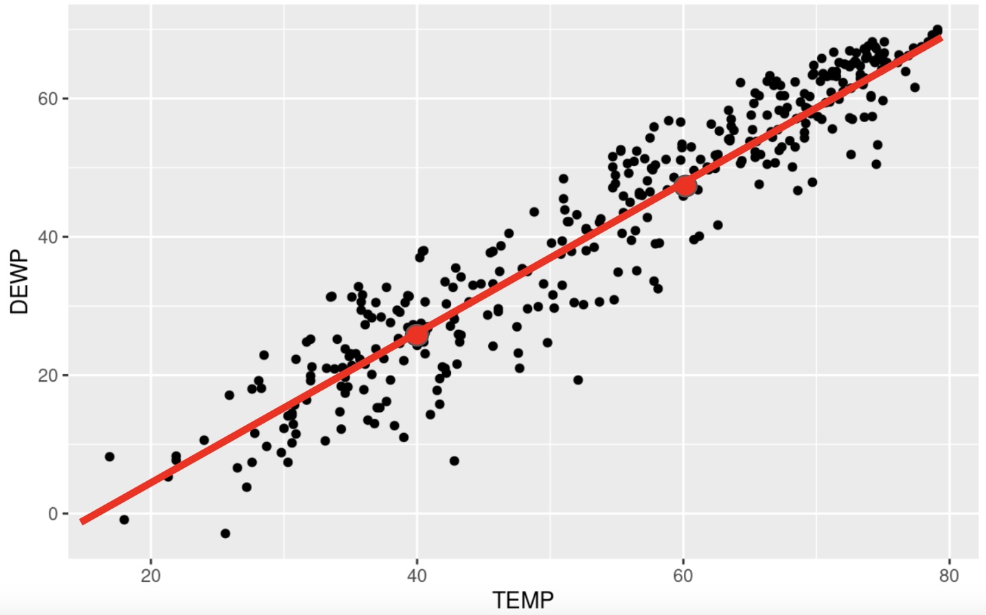 When picking two points to plot, make sure you pick two values that are relevant to the data. In this case, the explanatory variables run from about 20 to 80, so let’s pick the values of \(x_1 = 40\) and \(x_2 = 60\) to create the points for the model. All we do is put these values into the model to see what response values pop back out :