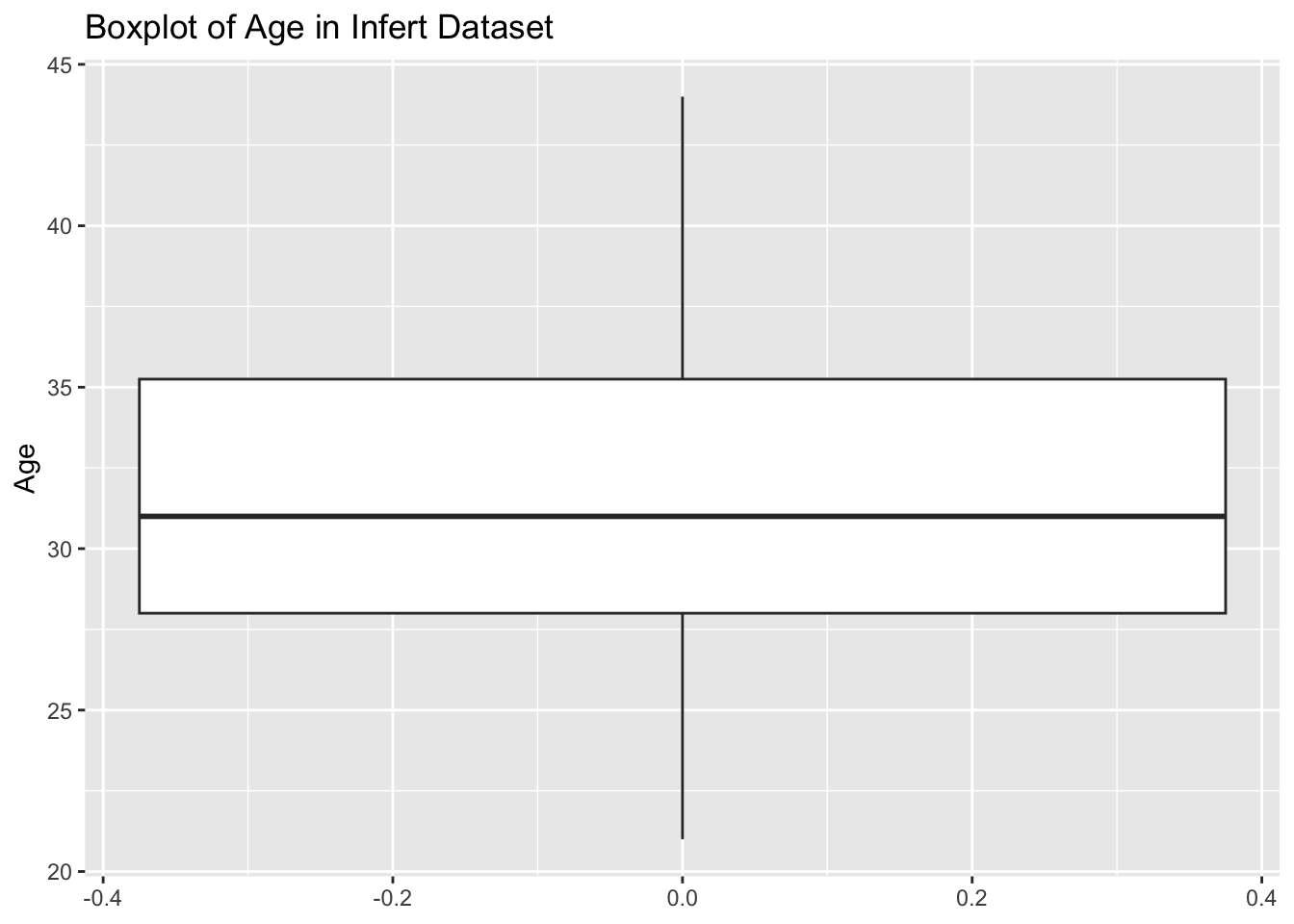 labs(title = "Boxplot of Age in Infert Dataset", y = "Age")