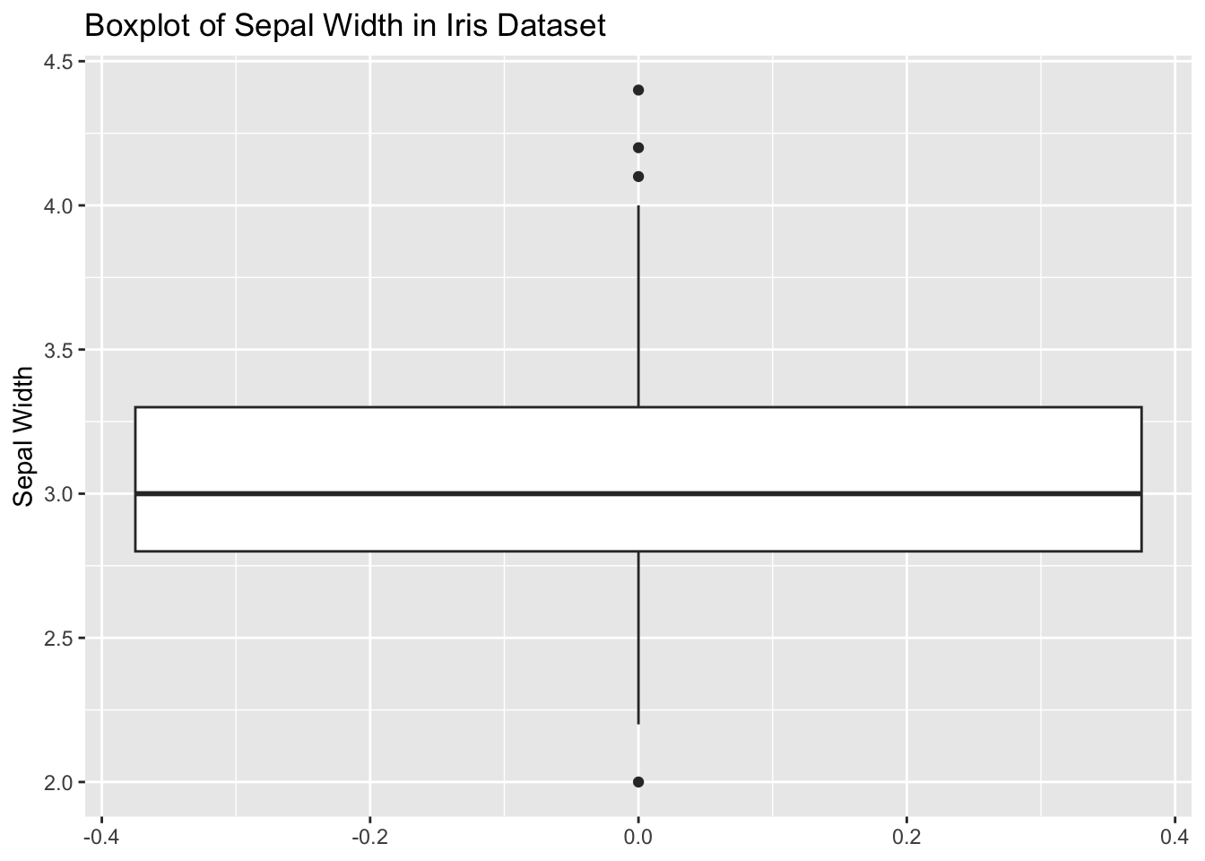 labs(title = "Boxplot of Sepal Width in Iris Dataset", y = "Sepal Width")