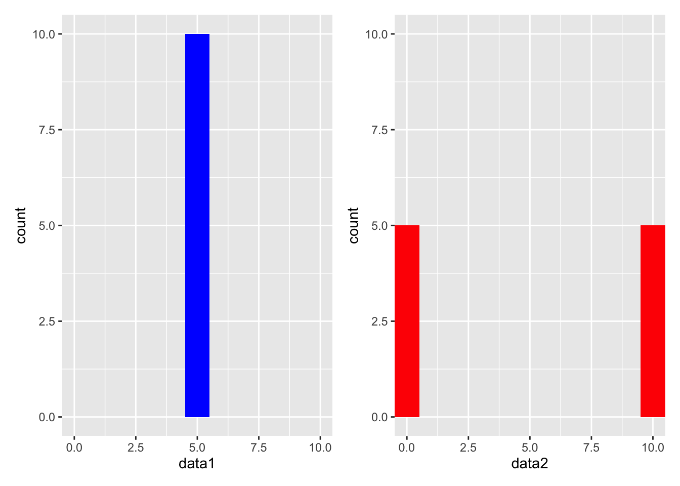 library(ggplot2)We have discussed Measure of Centrality and why they are important when trying to describe a data set. There are some limitations as to what that information can tell you. For instance, consider the following two data sets :