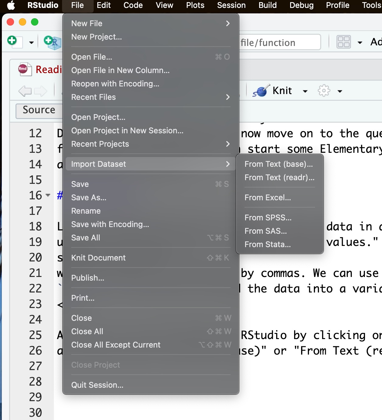 A CSV file can be upload to RStudio by clicking on “File” and then “Import Dataset” button and selecting “From Text (base)” or “From Text (readr).”