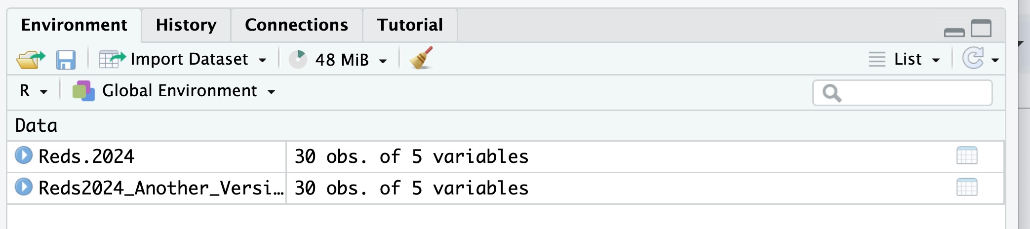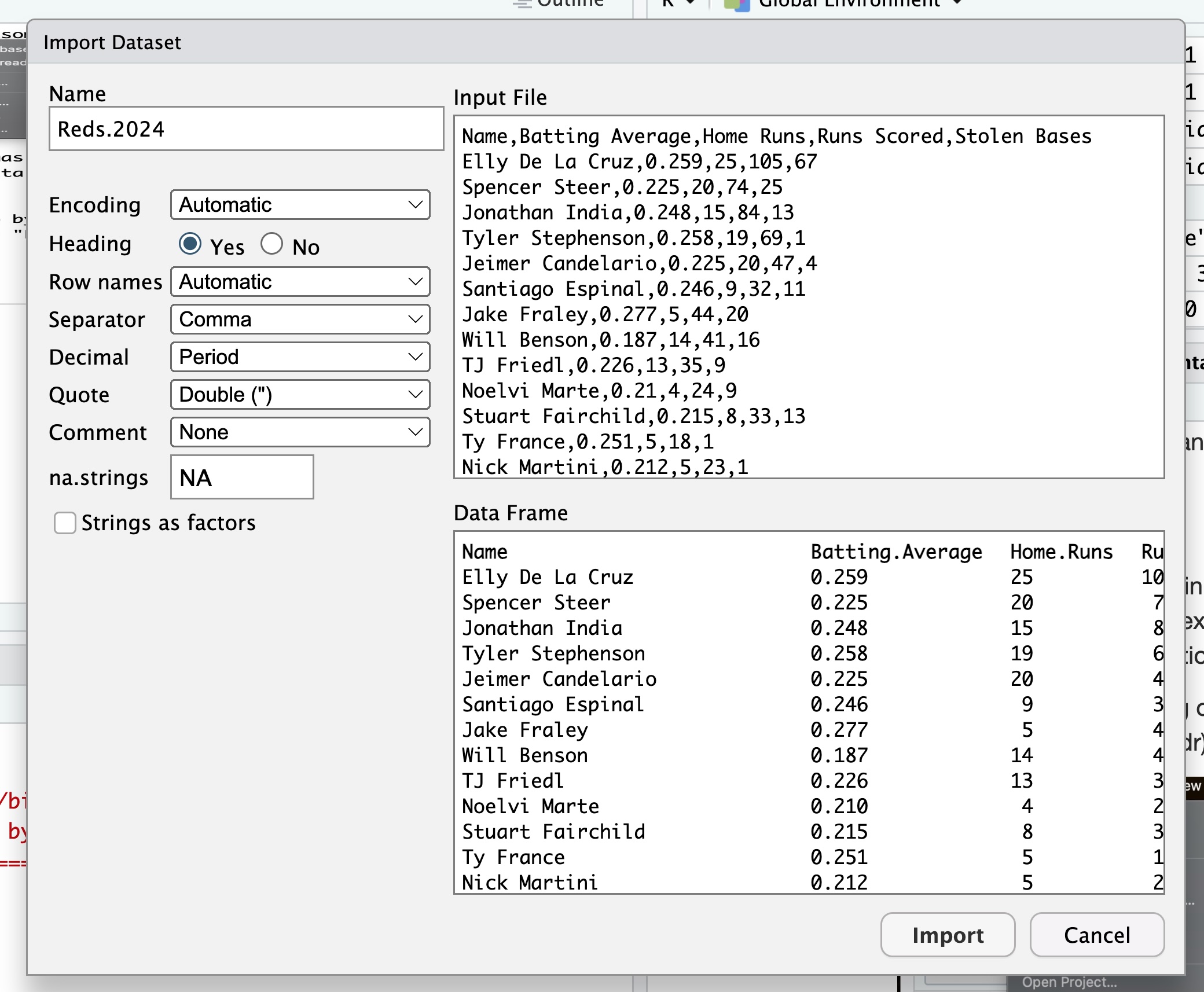 If you look in the upper left hand corner, you will see that you are given a choice for the name of your file. The default one given is Reds.2024, but you can change that to anything you wish. I went ahead and just kept this default name. I clicked on the “Import” button and the data was loaded into RStudio into the variable Reds.2024. You can look at the variable in the Environment tab :
