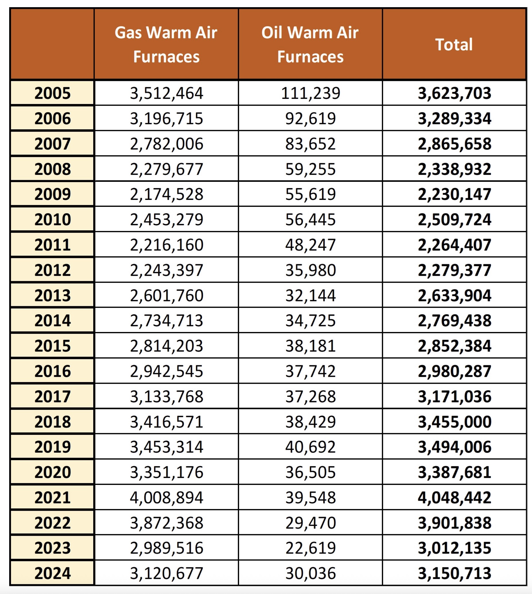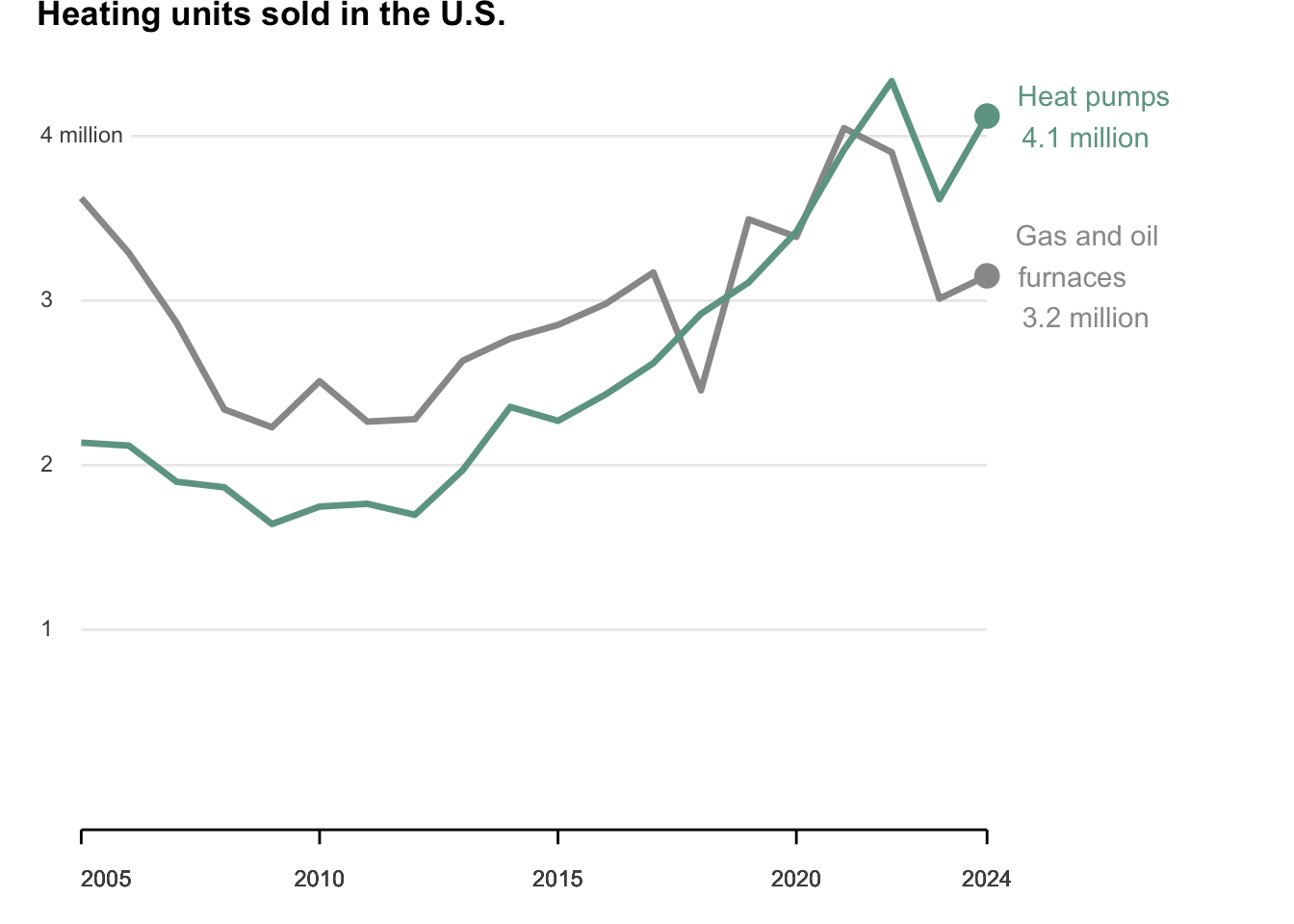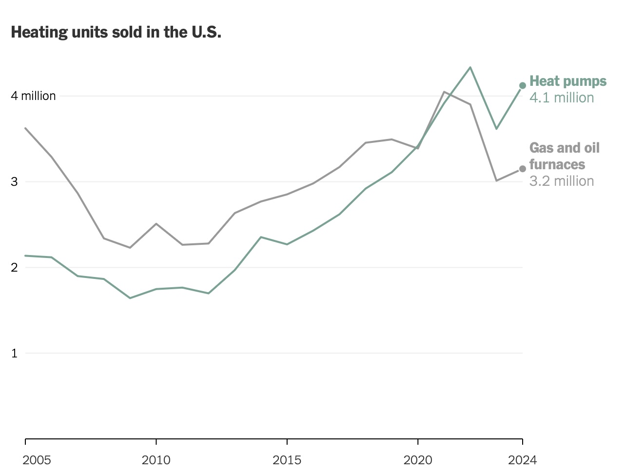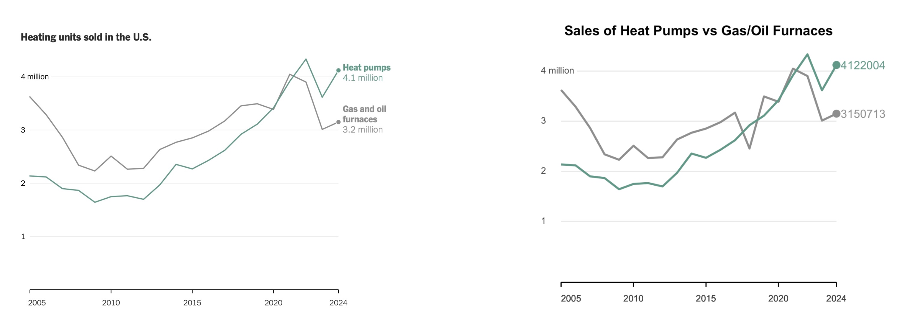 The article discusses the impact of a new policy on the number of heat pumps that are sold versus the number of gas/oil furnaces that are sold. The author uses data from the past twenty years to compare the sales of the two types of heating systems.