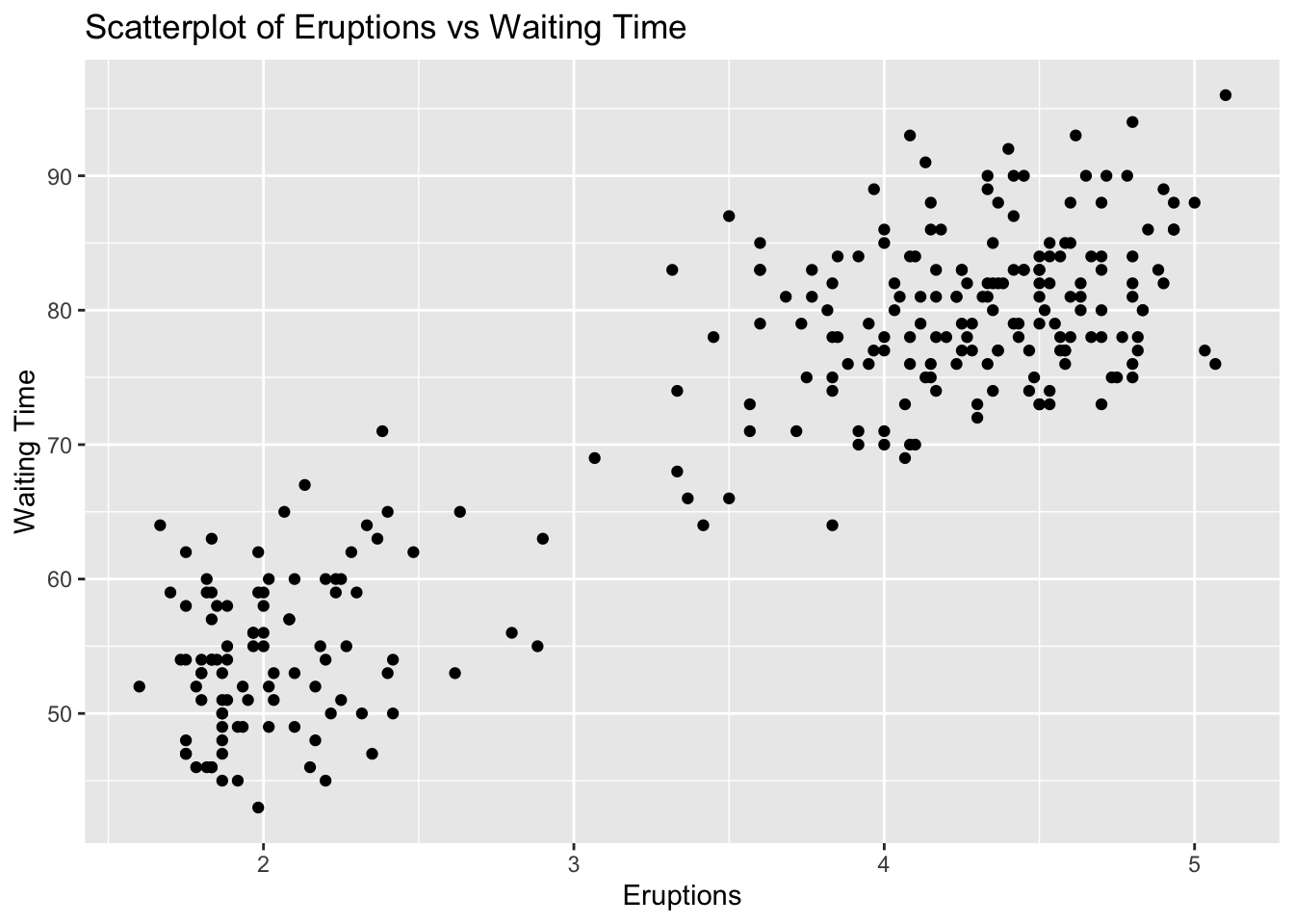 # Create scatterplotggplot(faithful, aes(x = eruptions, y = waiting)) +geom_point() +labs(title ="Scatterplot of Eruptions vs Waiting Time", x ="Eruptions", y ="Waiting Time")
