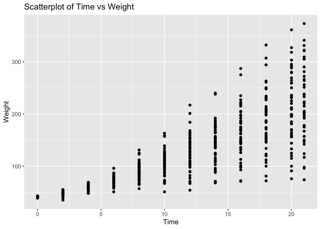 # Create scatterplotggplot(ChickWeight, aes(x = Time, y = weight)) +geom_point() +labs(title ="Scatterplot of Time vs Weight", x ="Time", y ="Weight")