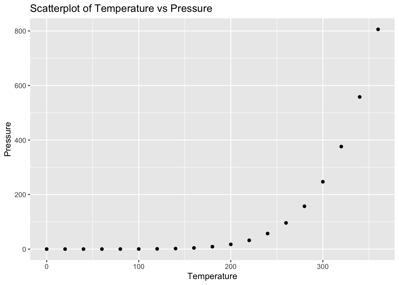 # Create scatterplotggplot(pressure, aes(x = temperature, y = pressure)) +geom_point() +labs(title ="Scatterplot of Temperature vs Pressure", x ="Temperature", y ="Pressure")
