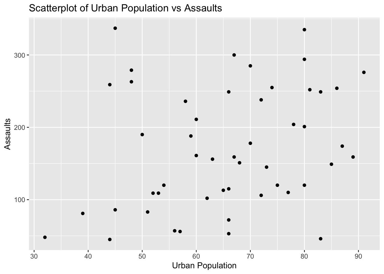 # Create scatterplotggplot(USArrests, aes(x = UrbanPop, y = Assault)) +geom_point() +labs(title ="Scatterplot of Urban Population vs Assaults", x ="Urban Population", y ="Assaults")